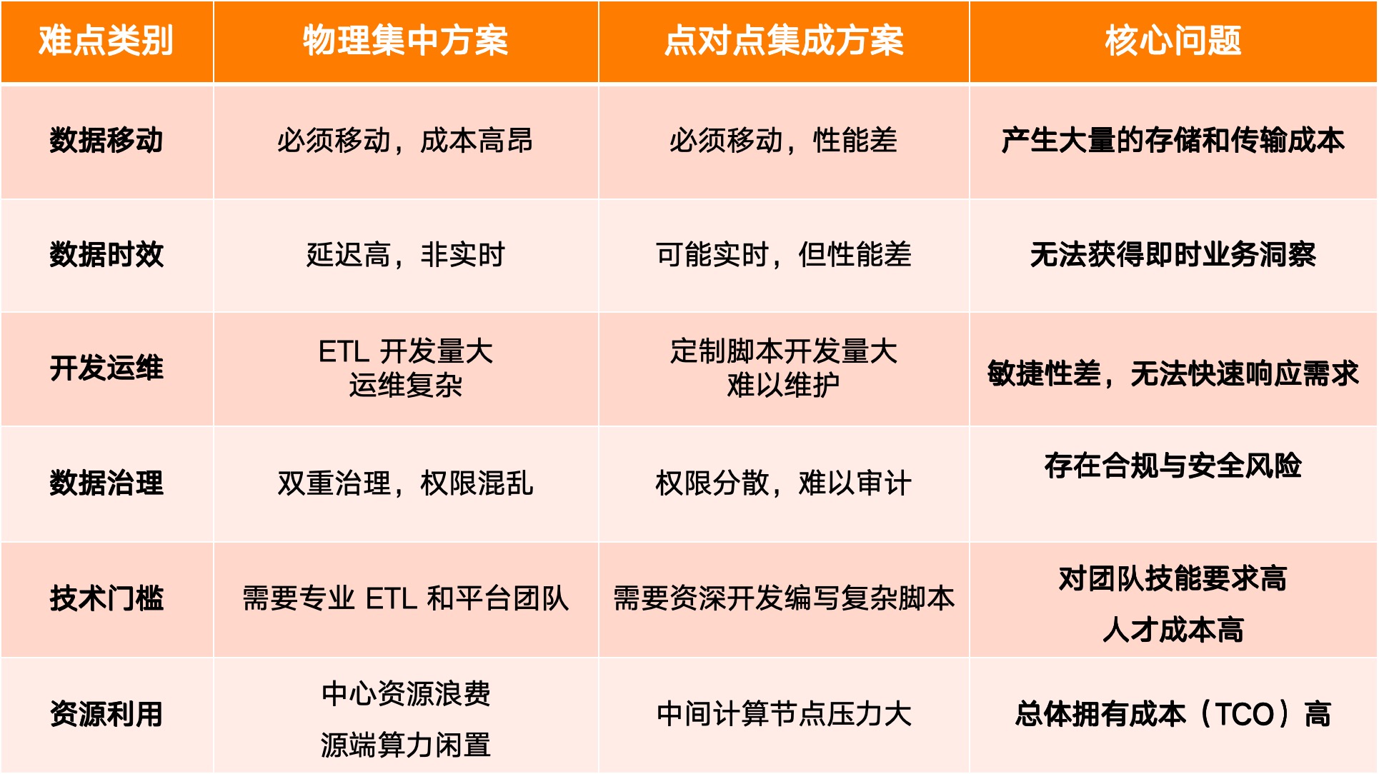 即不集中存储数据,跨成员企业分析时通过编写自定义脚本或 API 临时拉取数据,在内存或临时库中进行关联计算。但其同样面临五大技术难点: