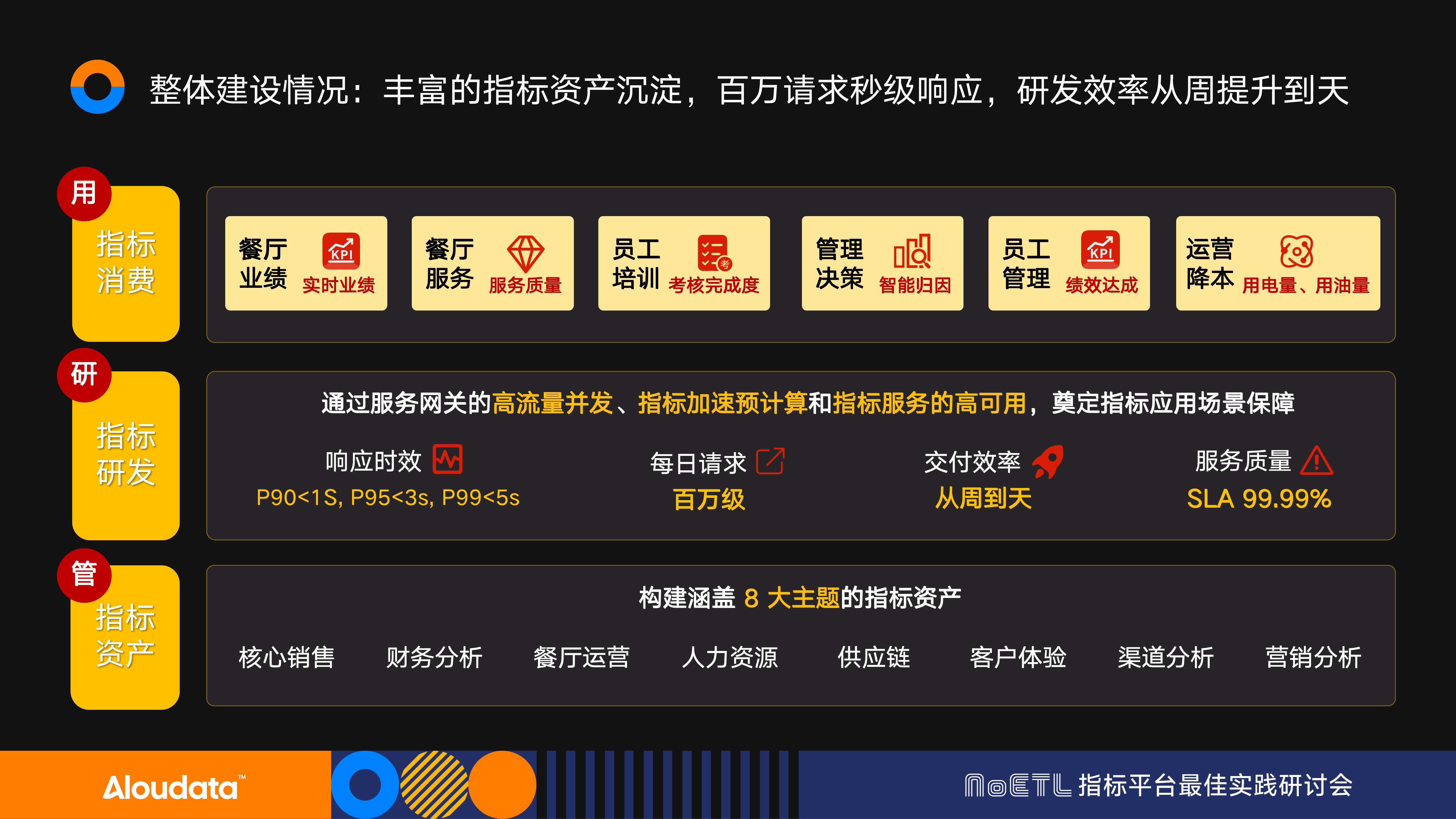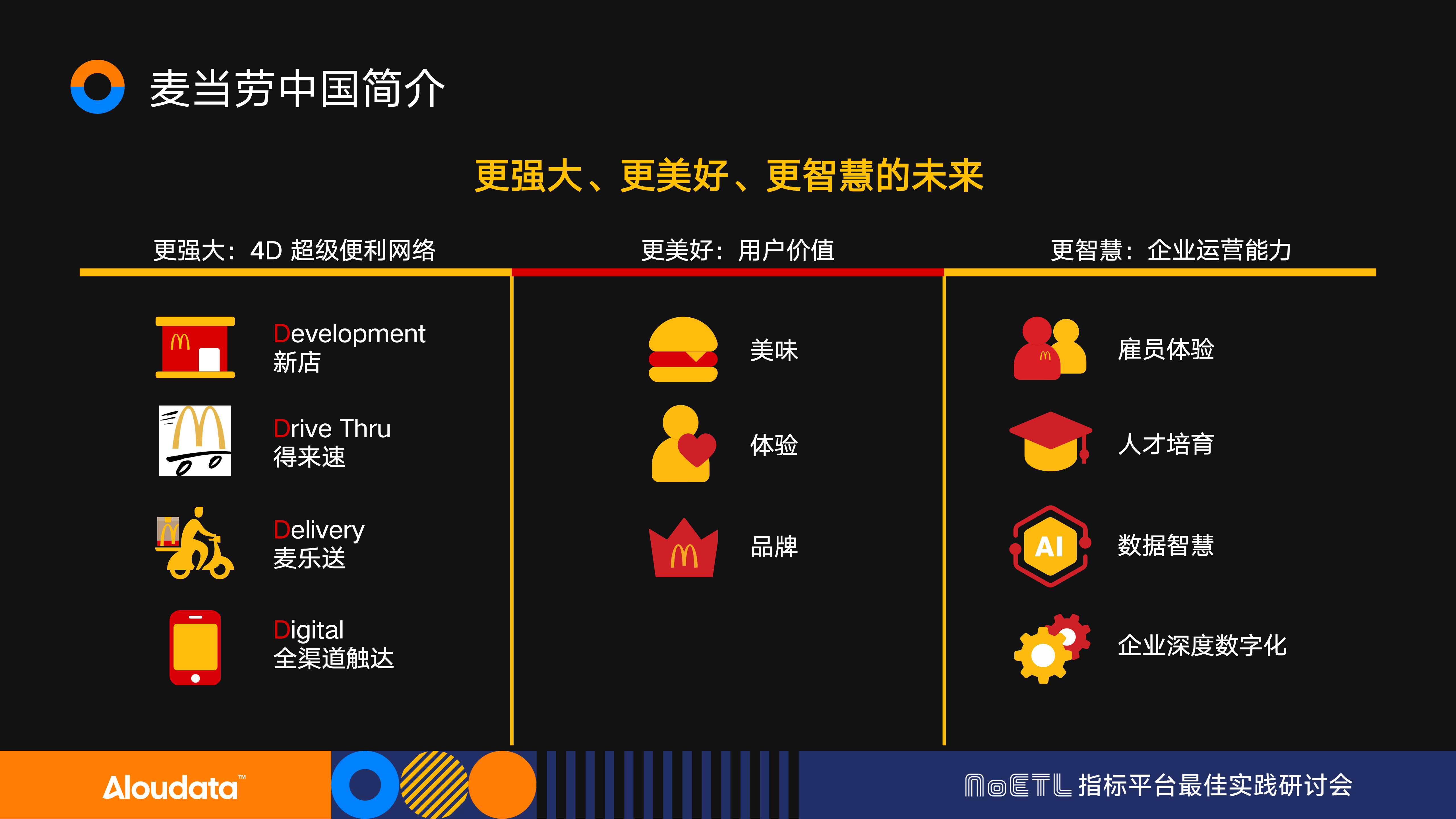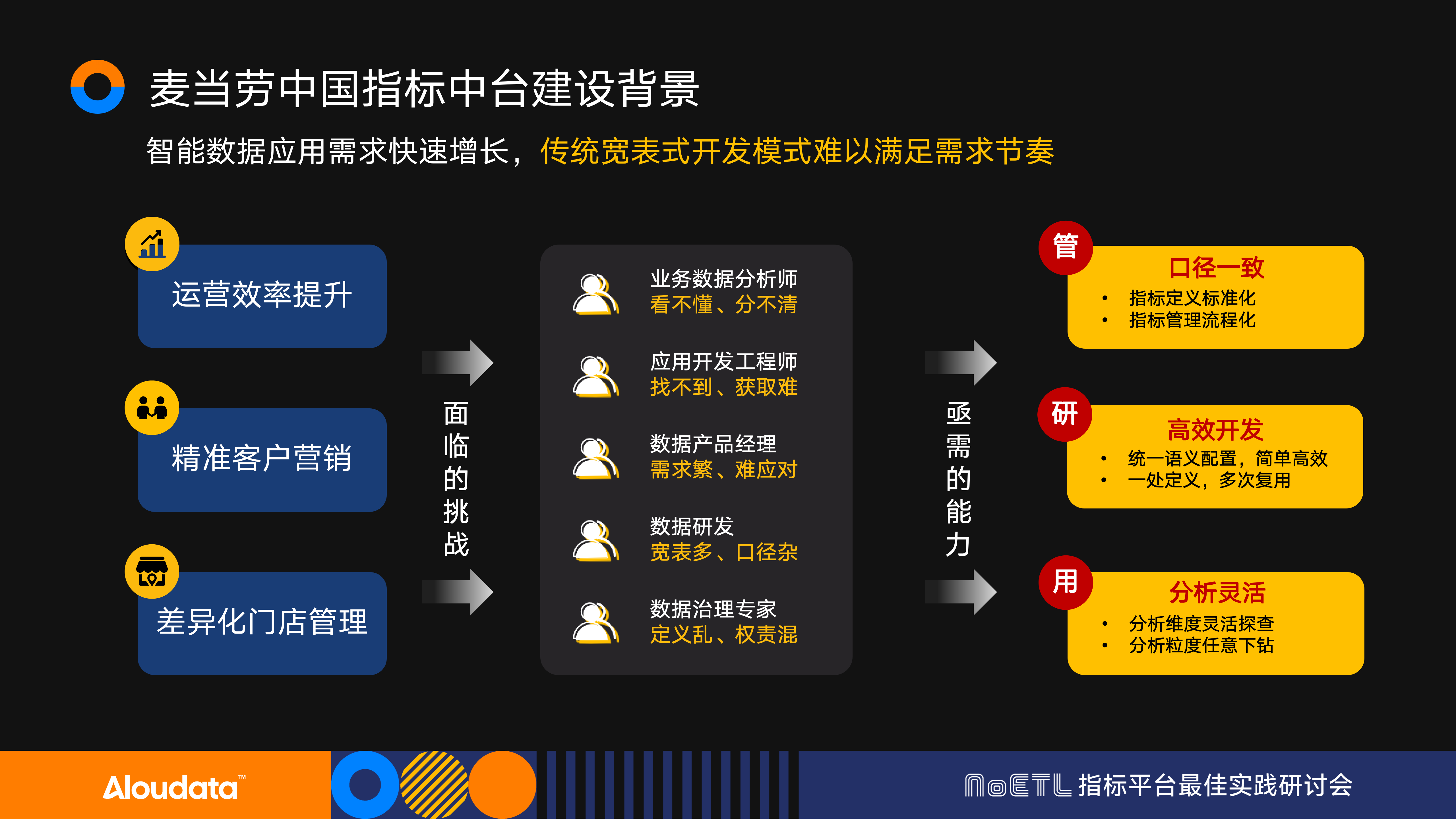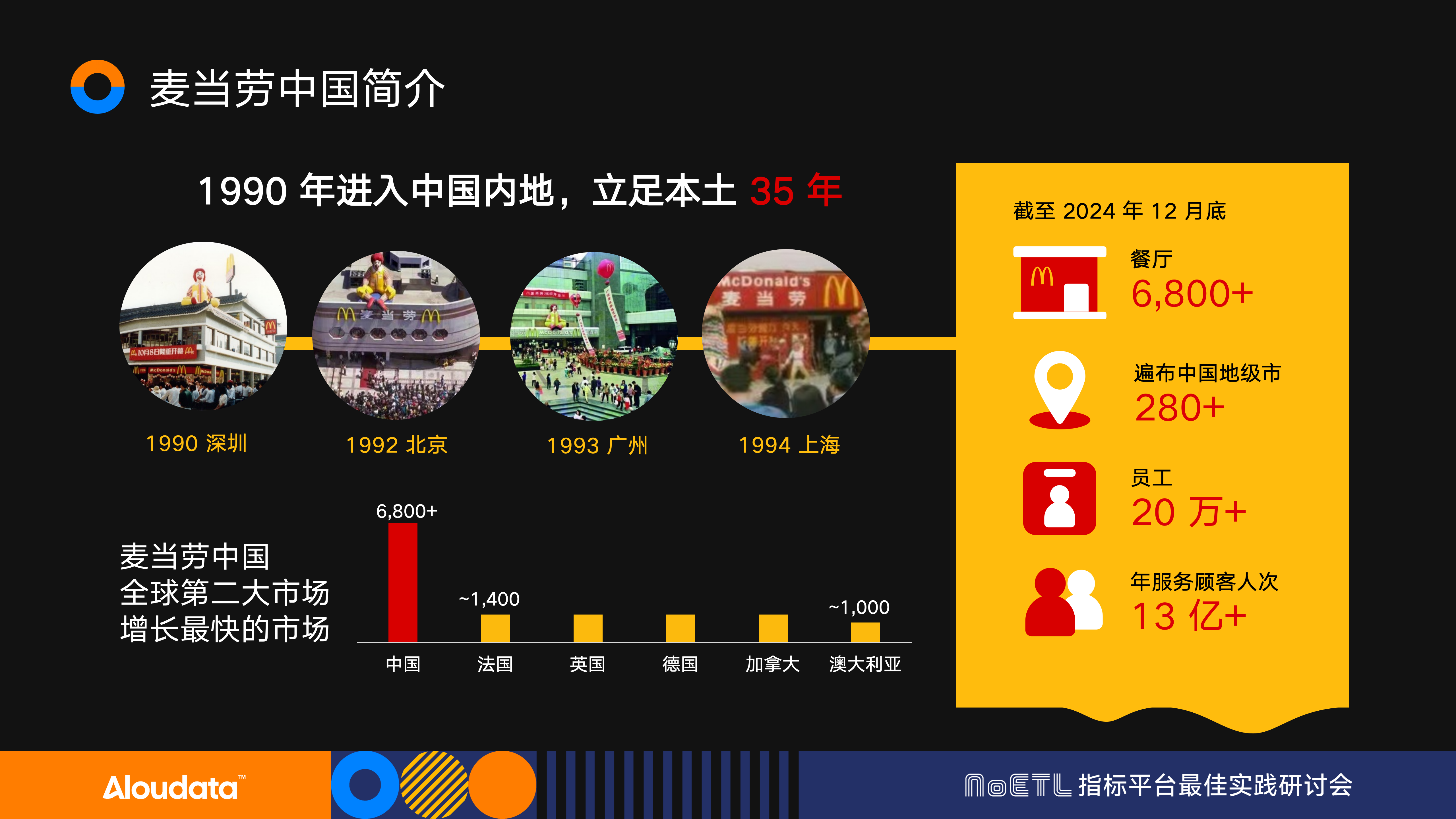各位老师好,今天很高兴能与大家分享麦当劳中国在指标中台建设方面的经验。过去一年,我们与 Aloudata 合作,成功在餐饮行业落地了指标中台,并将其应用于多个实际业务场景。希望通过今天的交流,能为大家带来一些启发。