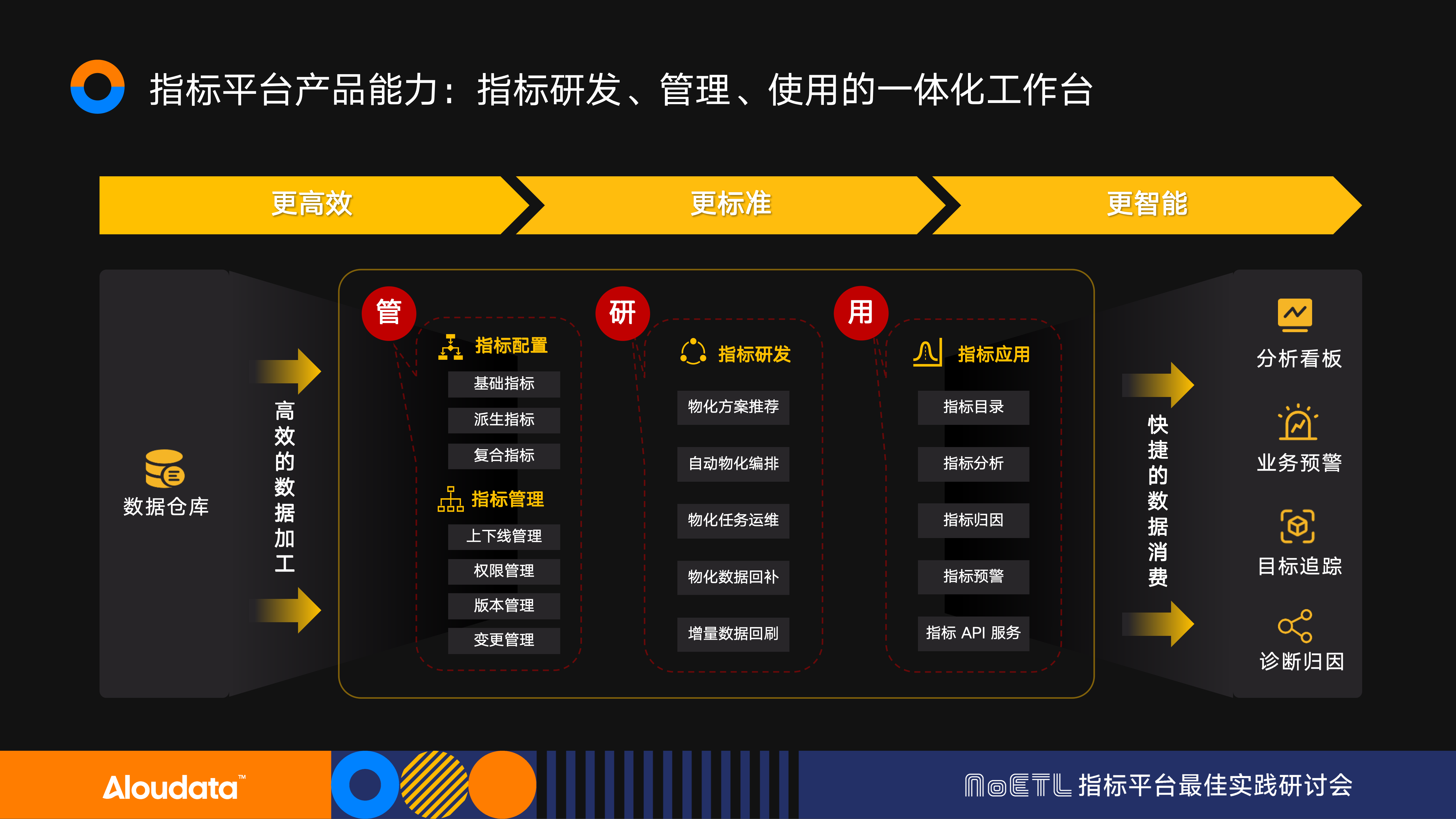 • 其次,研发团队希望有一个高效开发的工作台,避免重复制作宽表,能够通过统一的语义配置快速实现指标,满足业务需求,并实现一次开发、多处复用。