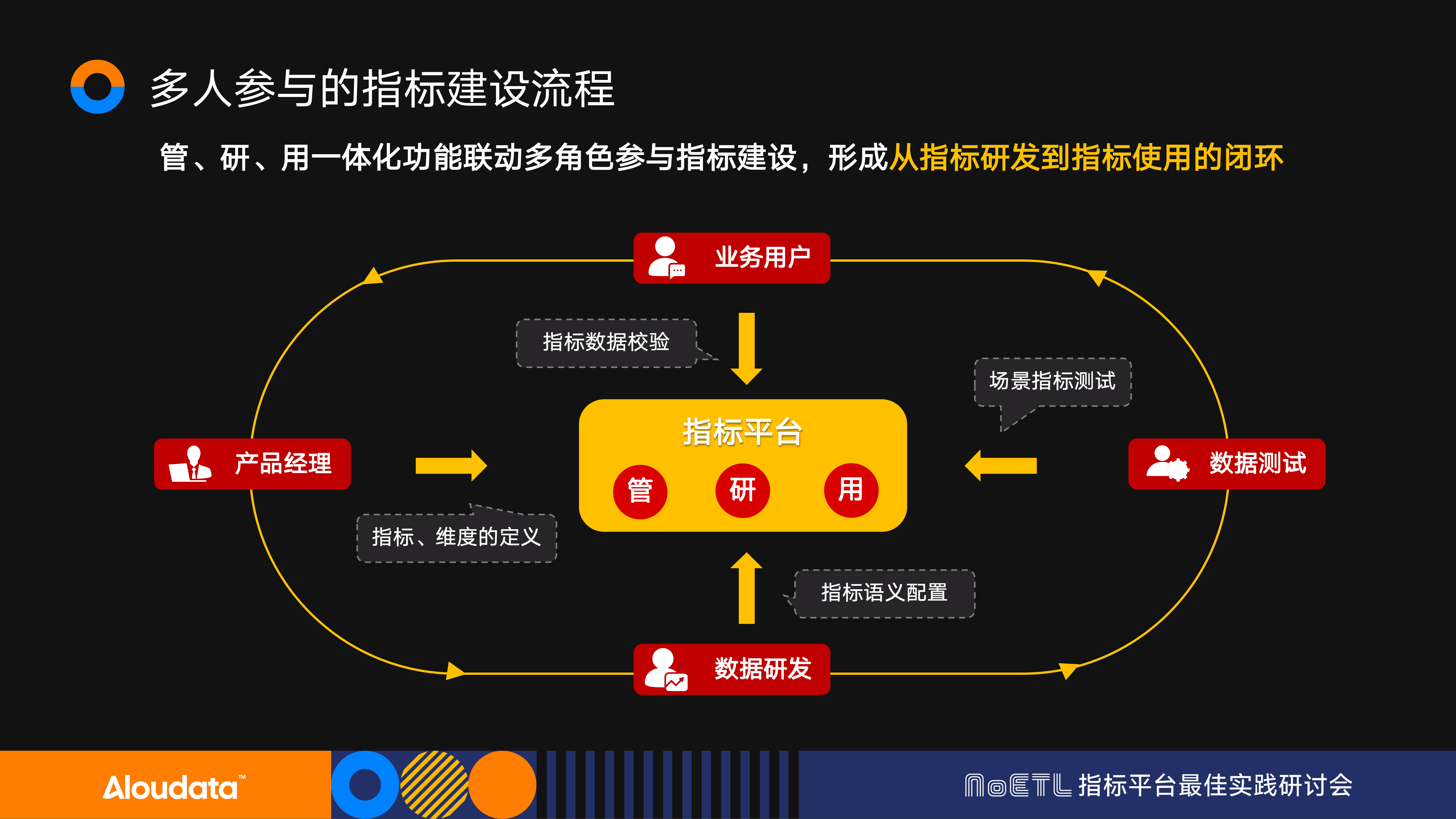 此外,我们借助建设指标中台的契机,建立了多角色协同的工作流程。主要参与的角色包括业务用户、数据产品经理、数据研发和数据测试,他们各司其职,每个角色都与指标平台有相应的功能对接点,共同协作构建我们的指标体系。
