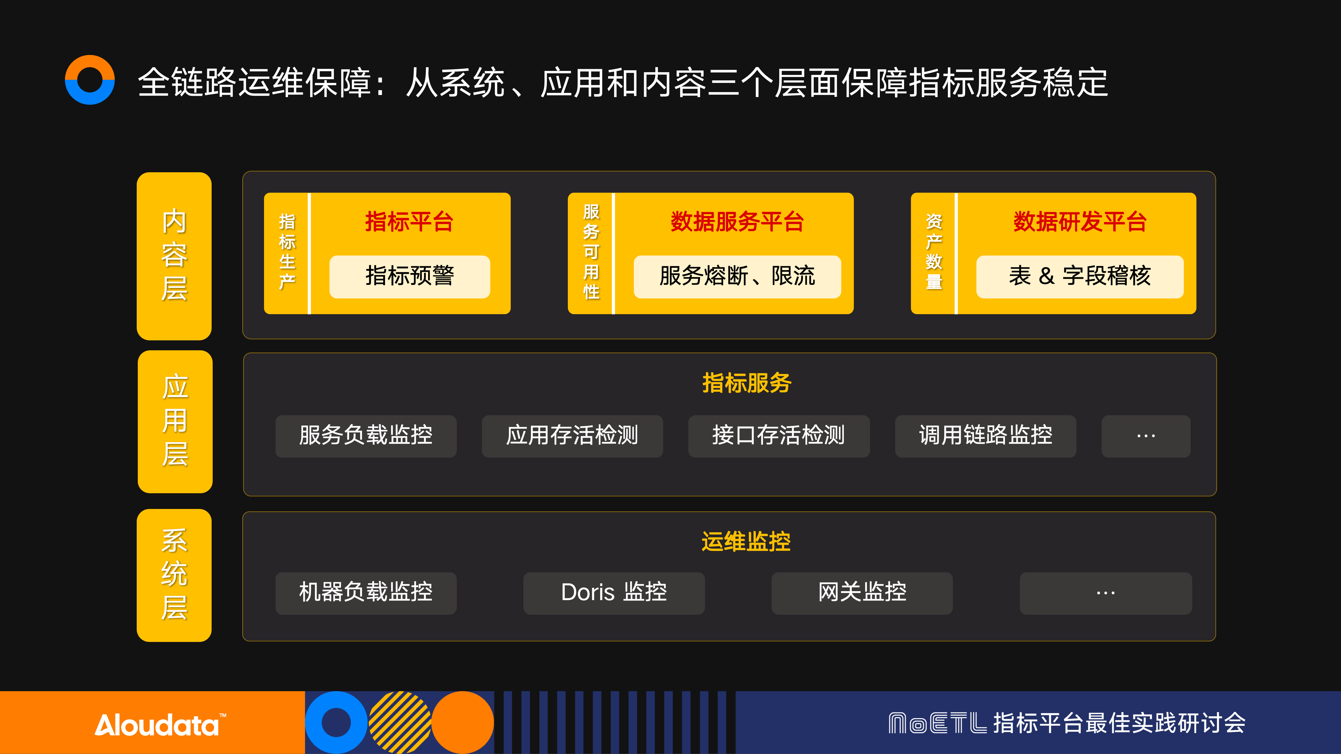 仅有研发能力还不够,我们还需要在运维保障层面进行确保指标中台的稳定运行。我们从系统层、应用层和内容层三个层面入手。
