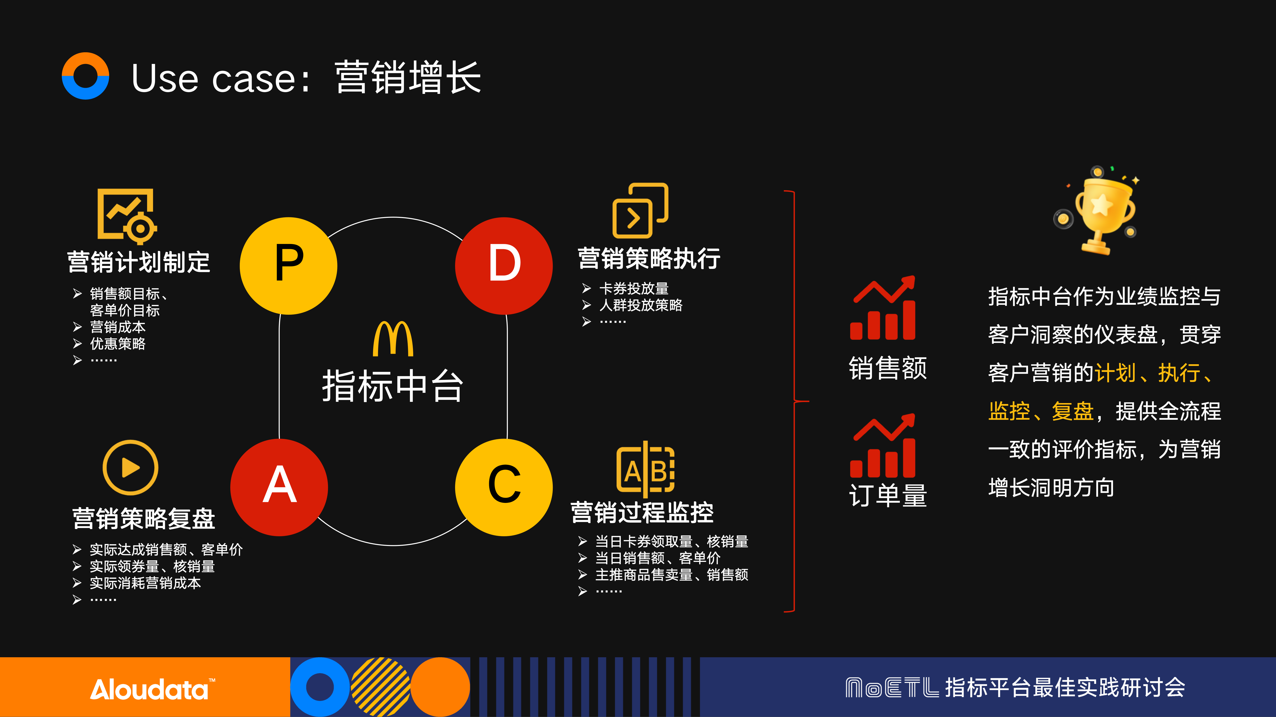 接下来,我们来看下在餐饮行业很重要的营销增长这个场景中,指标中台扮演了怎样的角色。通常,我们在启动一场营销活动时,会遵循 PDCA 循环,即从计划制定、策略执行、过程监控到策略复盘。这一过程中,需要监控的指标非常多,例如营销目标、物料投放量、员工配置等。
