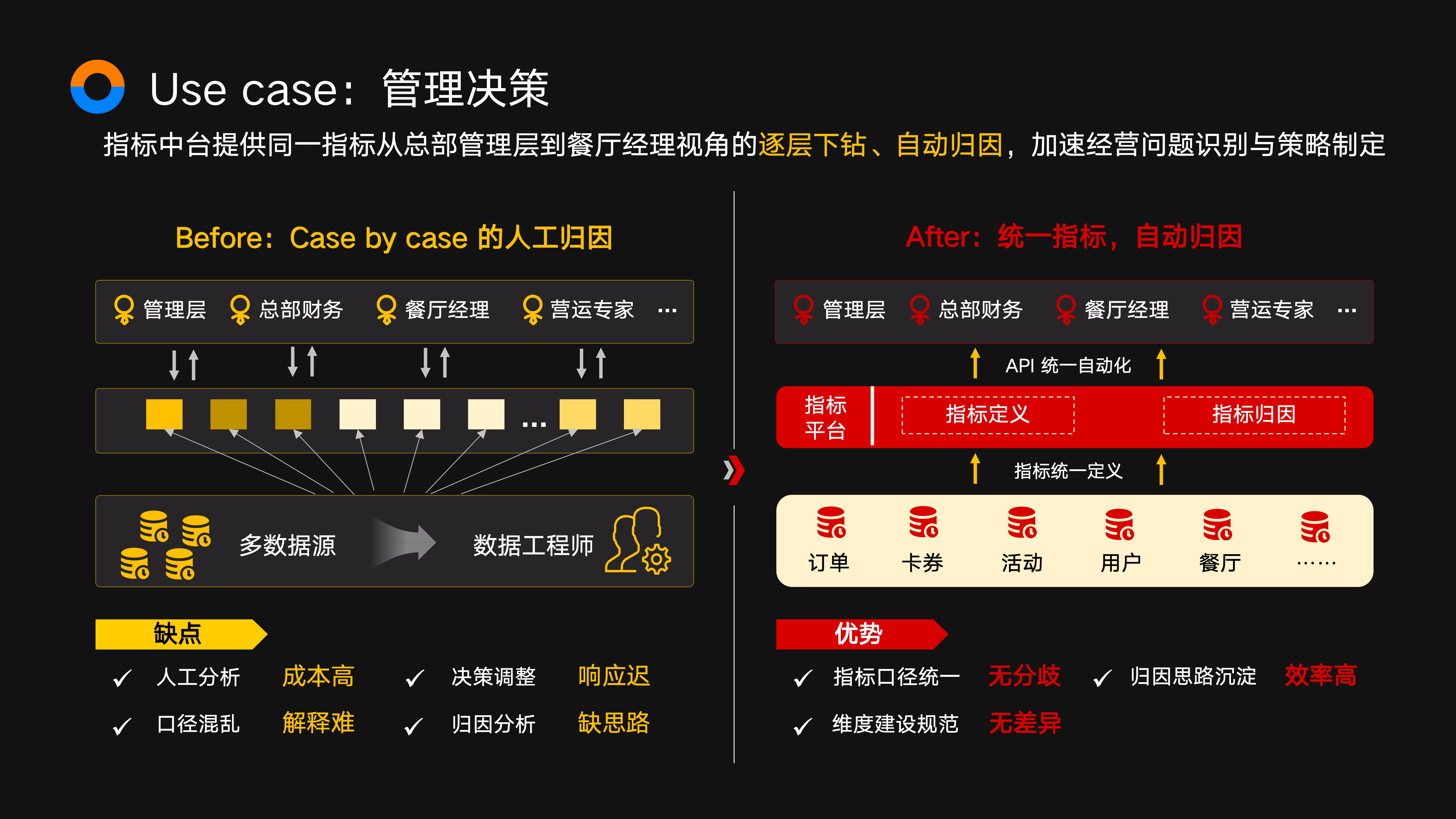 最后,我们来谈谈每个公司都会涉及的管理决策场景。在传统模式下,我们通常依赖各种宽表和报告来支持决策。然而,当业绩不达标时,各部门往往会各自分析,临时取数或查看定制报表,缺乏统一的思路和一致的数据。这种临时性的分析通常匆忙且缺乏系统性,难以找到问题的核心。指标平台为我们提供了同一指标从总部管理层到餐厅经理视角的逐层下钻、自动归因,解决了这一问题。通过将业务部门的归因思路标准化,并结合阈值监控和告警推送,我们不仅确保了指标的统一性,还实现了归因思路的一致性和可沉淀性。这一过程还推动了企业内部指标和维度的定义标准化,沉淀了数据资产,并规范了数据创建和消费的流程。可以说,指标平台在管理决策场景中,为企业提供了更高效、更系统的分析支持。