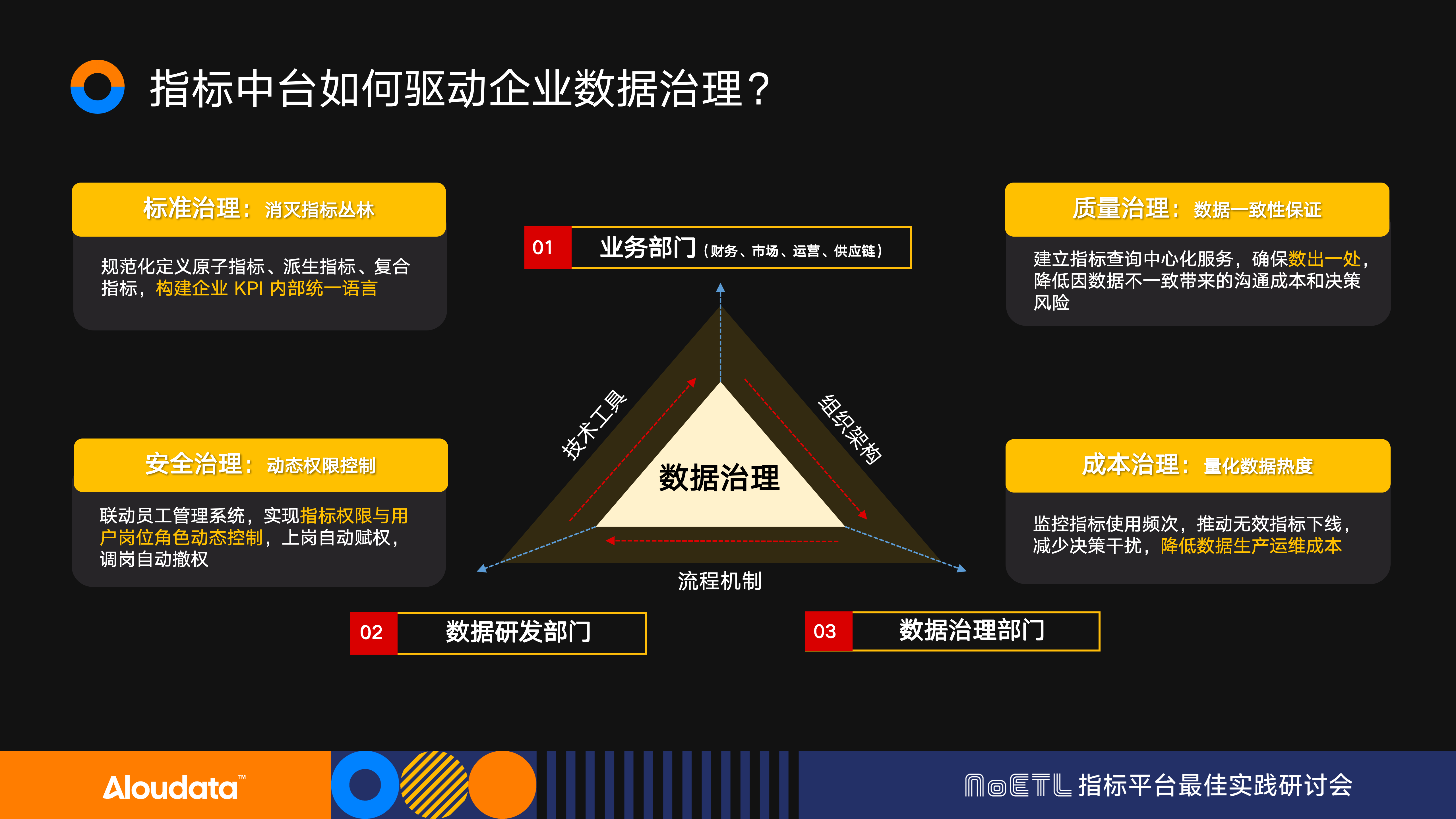 其次是质量治理。通过中心化的查询服务,指标平台确保了“数出一处”,减少了因数据不一致带来的管理决策风险和沟通成本。
