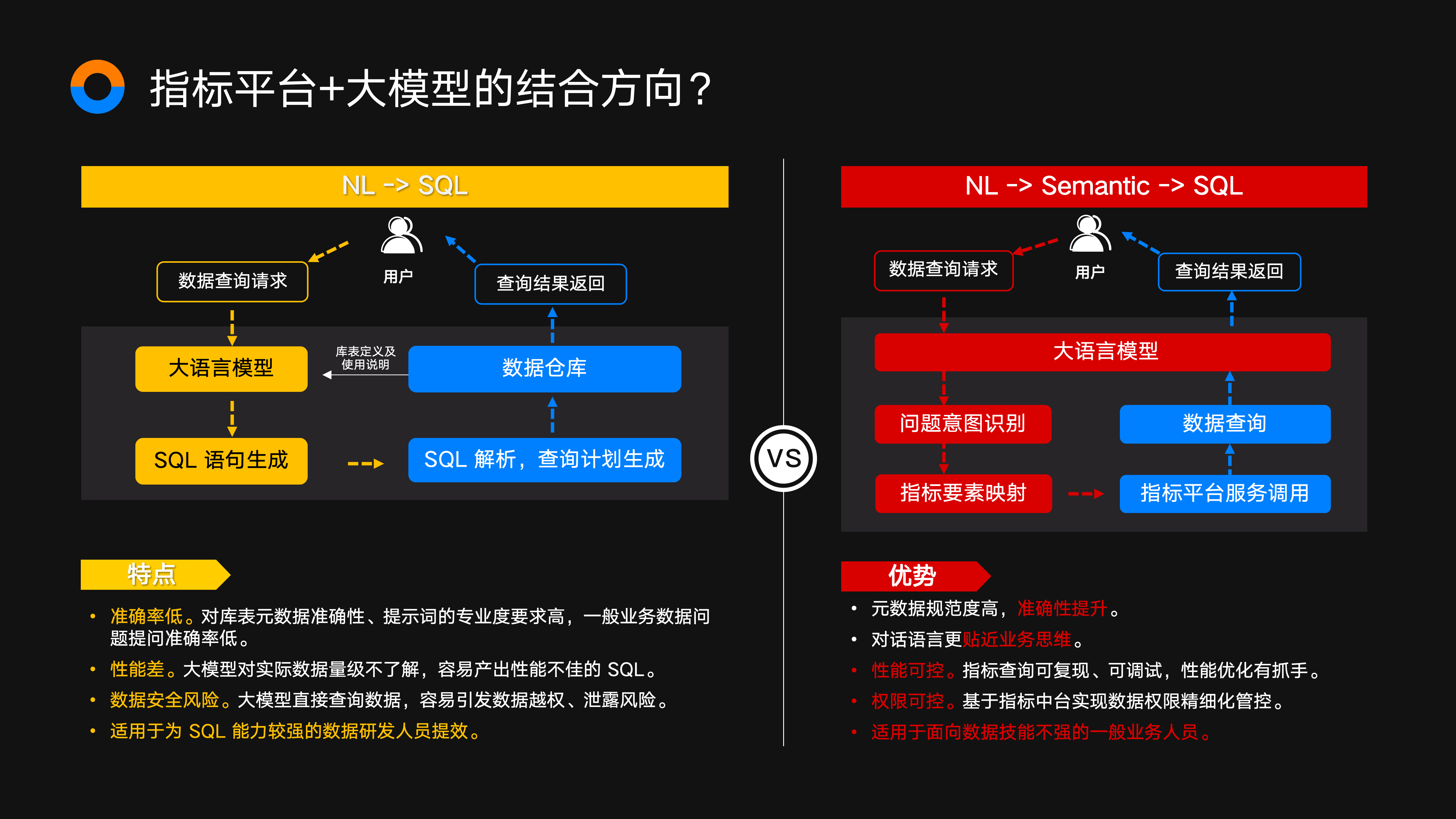 此外,大模型虽然能够生成 SQL,但对数据量的感知不深,可能会生成性能较差的查询。再者,数据安全风险也是一个重要问题。如果所有人都通过 Chat2SQL 方式查询数据,权限控制将变得困难,容易导致数据越权和泄露。因此,NLtoSQL 可能更适合那些 SQL 能力较强的数据研发人员,用于提高效率。但对于数据技能较弱的业务人员,这种方式并不适合。为了让数据真正普惠,我们需要一种门槛较低、精准度较高的交互方式。在这种情况下,构建中间语义层可以有效减少对库表元数据精准度和规范度的依赖,以及对提示词专业性的要求。语义层的引入不仅解决了这些问题,还使得在大模型调用指标平台时,过程更容易复现和调试,从而优化性能。