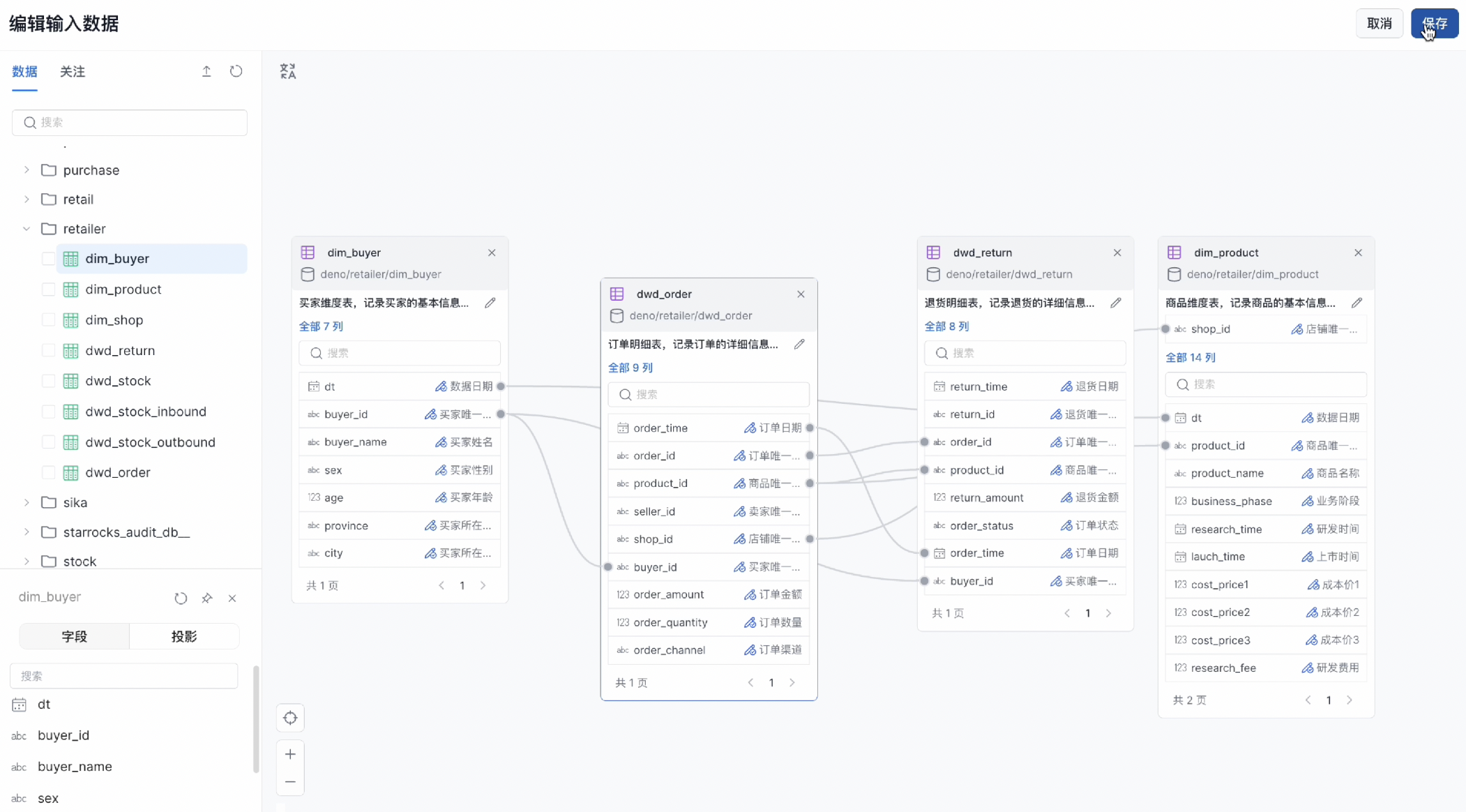 用户通过拖拽「输入数据」组件选择所需数据表。系统基于元数据信息自动识别表间关联关系和字段语义含义,为大模型提供上下文。用户也可手动补充或修正字段描述,以提升语义解析准确性。