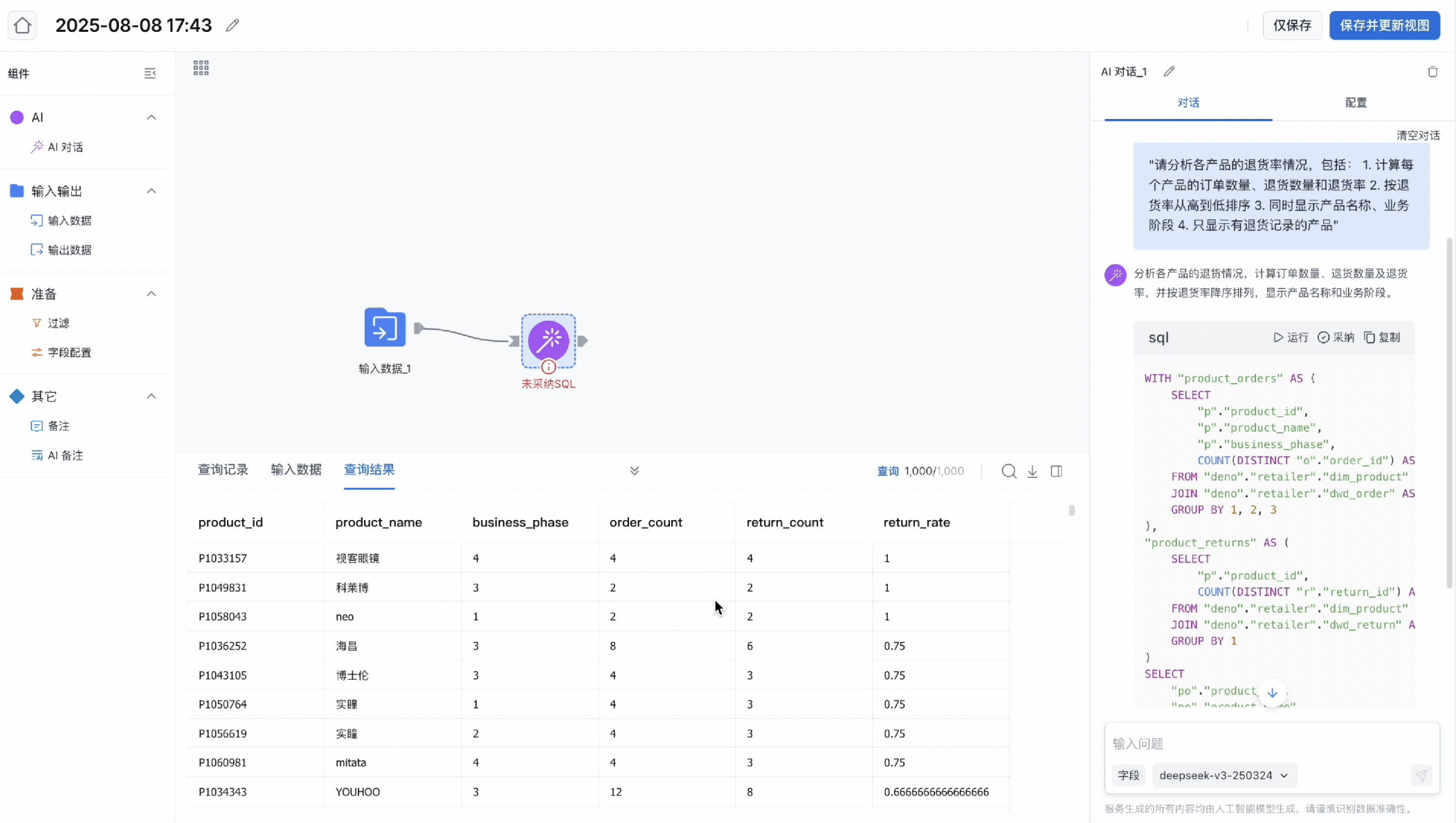 拖入「AI 对话」节点,与「输入数据」连接后,输入自然语言指令。系统自动解析需求并生成 SQL,点击「运行」即可执行查询,返回结果。