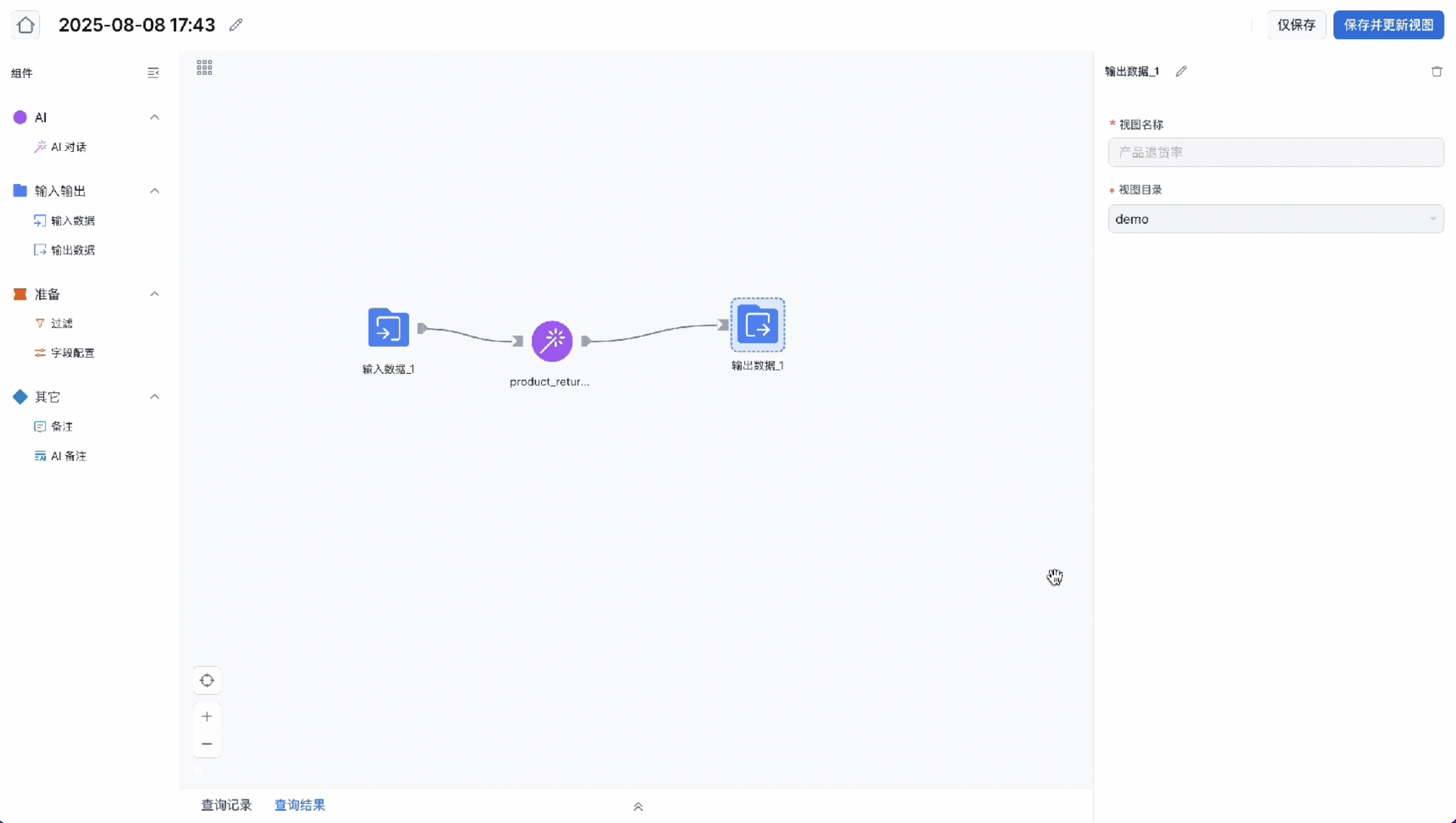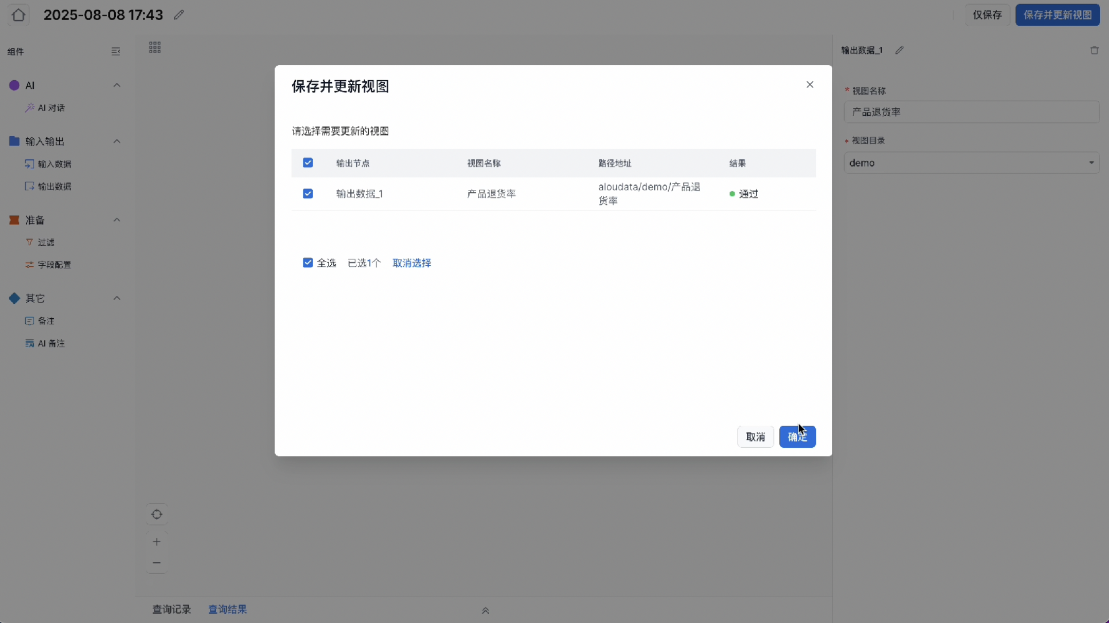 用户可将查询结果通过「输出数据」组件保存为逻辑视图,形成可复用的数据资产。在保存过程中,系统自动进行数据质量校验,能对数据的准确性、完整性等进行把关。同时,系统也支持一键加速,自动优化查询性能,并提供物化策略建议。