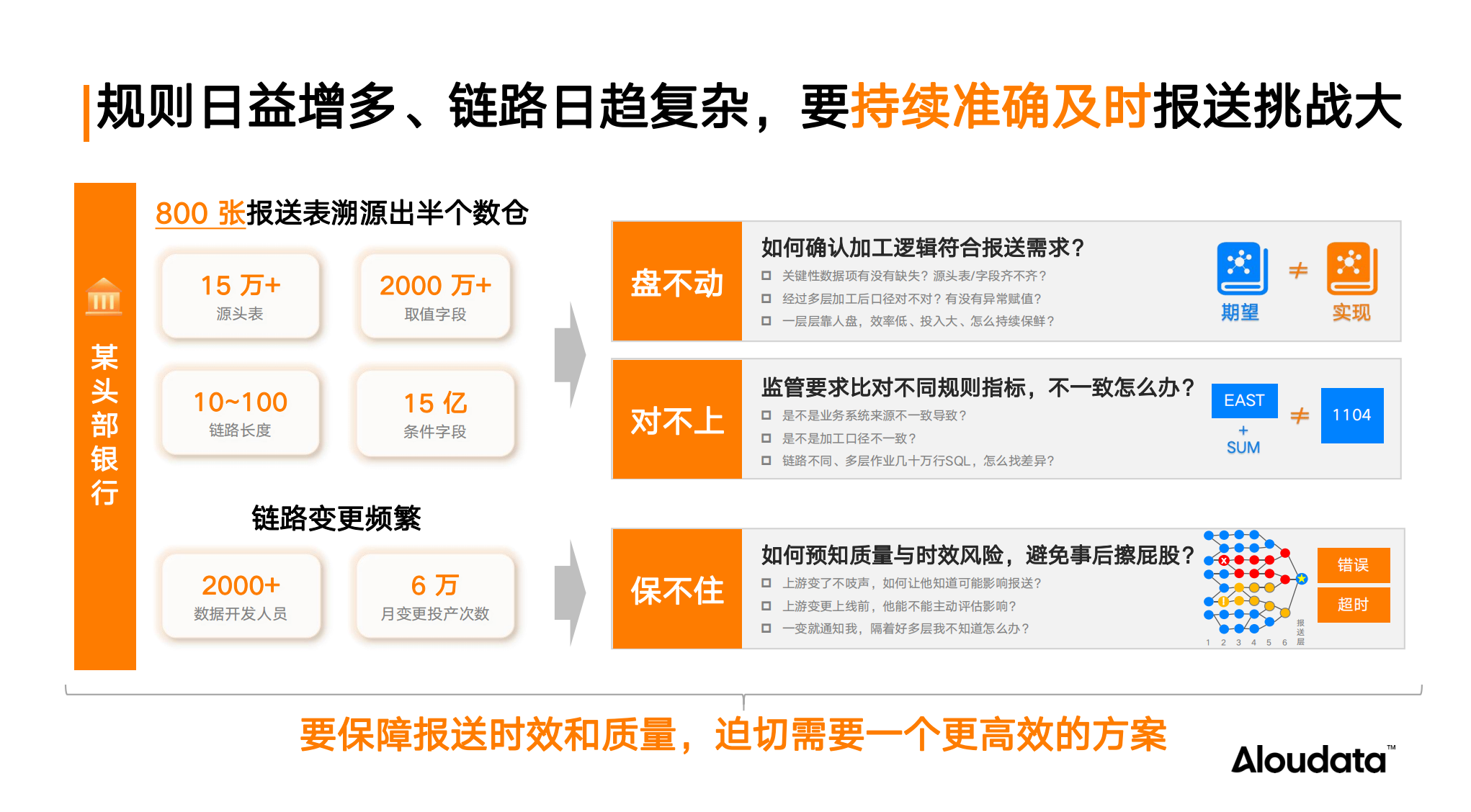 以某头部银行为例,其 800 张报送报表溯源出的源头表数量高达 15 万个,取值字段数量高达 2000 万个,链路长度在 10 层至 100 层之间。如此复杂度下,想要判断加工数据口径的准确性变得极为困难,因为需要通过人工对所有相关表进行逐一核查,工作量巨大,也难以实现持续“保鲜”。