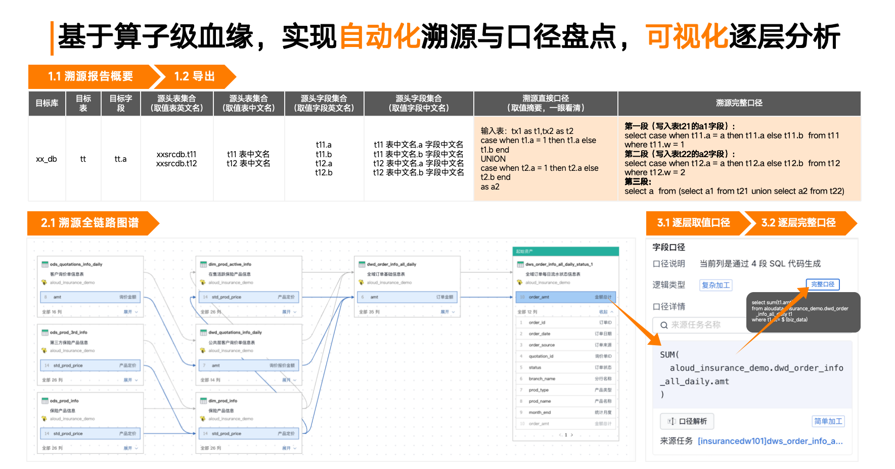 口径概括:在溯源过程中,Aloudata BIG 通过算子级血缘解析技术,能够将源头与溯源起点(即报送指标)之间的多层关系进行概括,便于用户理解数据链路。