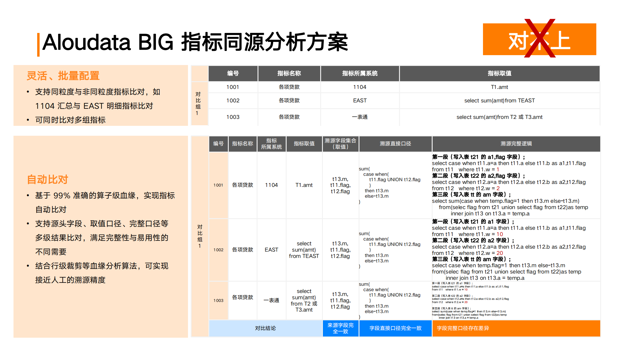 接下来来解决“对不上”的问题,我们提供的是 Aloudata BIG 指标同源分析自动化方案。此方案具备两大特点:一是可直接提供对比组,便于对比不同指标,如 1104、EAST 及一表通等系统中的同源指标。其中,1104 系统提供汇总性指标,EAST 系统提供明细指标,一表通系统则可能兼顾两者。