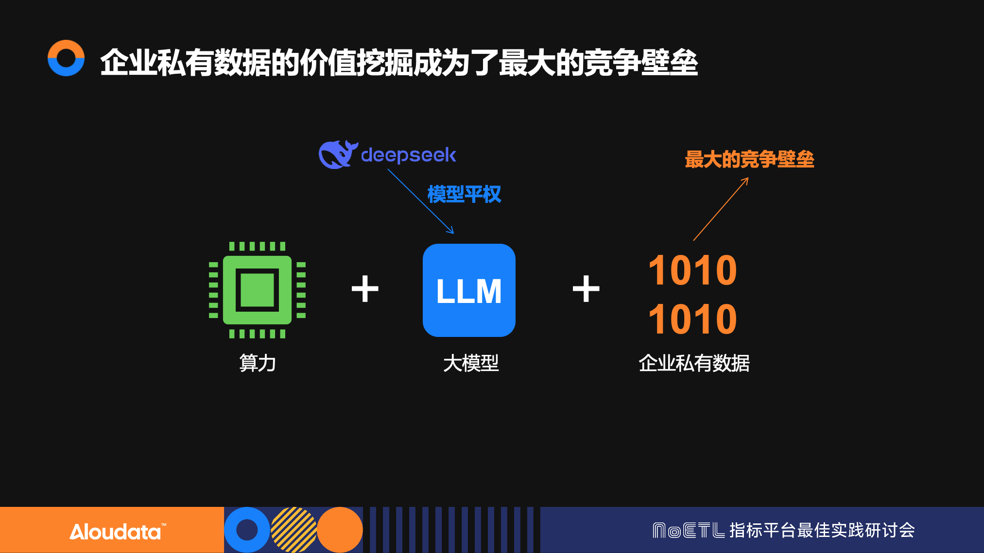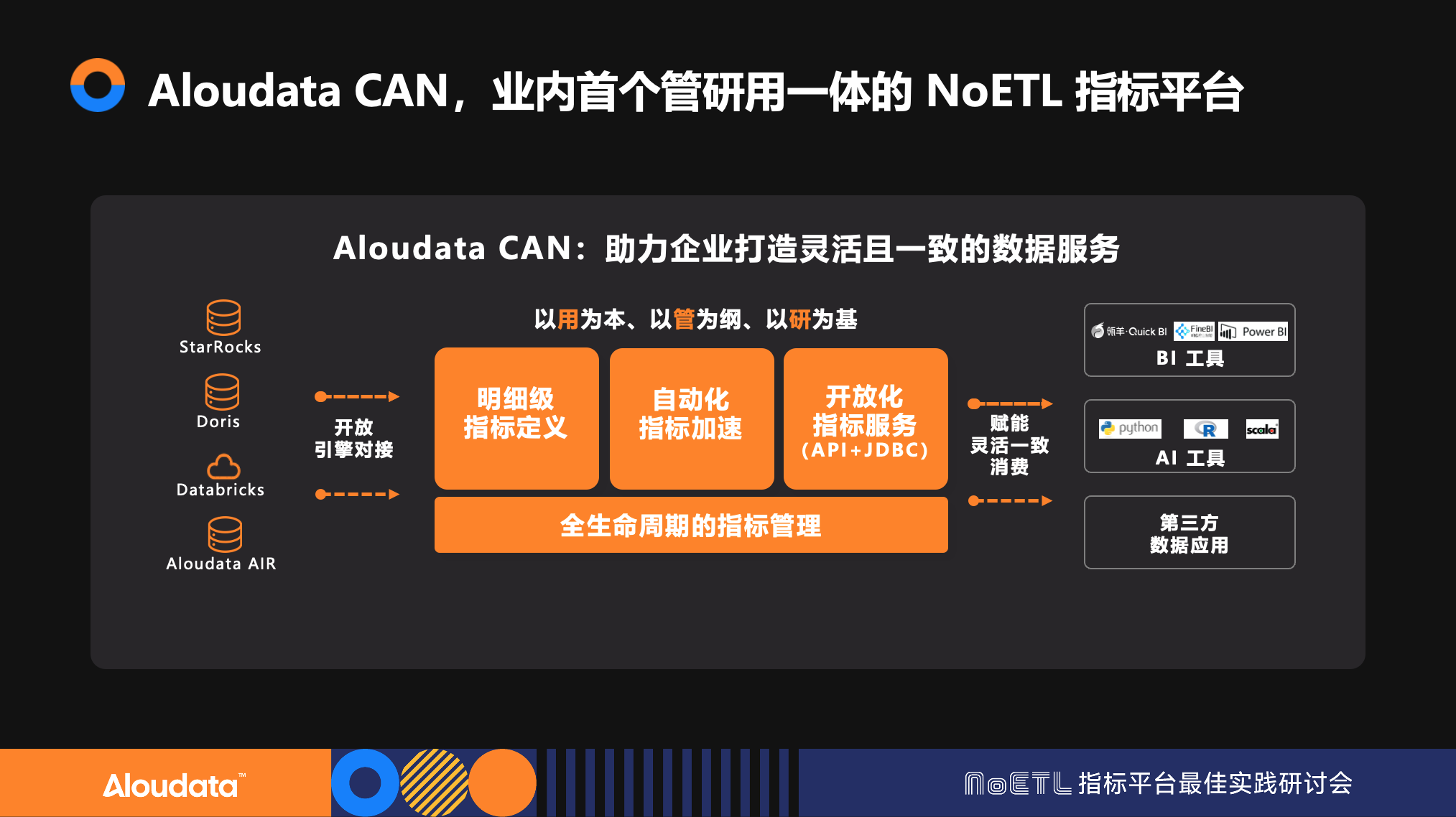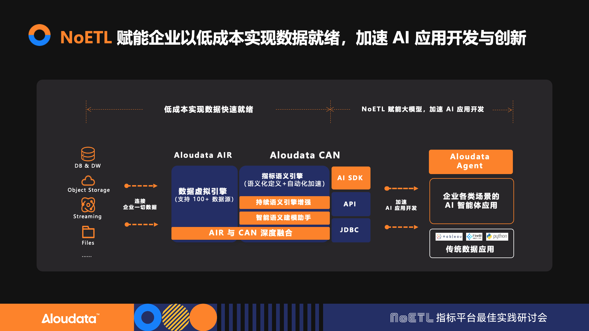 非常高兴今天有这么多朋友来参加 NoETL指标平台最佳实践研讨会。今天我的分享分三个部分。首先,我会回顾过去一年 Aloudata 在 NoETL 领域的探索和进展。其次,结合当前 DeepSeek 等大模型的热点,分享我们的观察与思考。最后,我会介绍 Aloudata CAN 指标平台在 Data for AI 与 AI for Data 两方面的能力升级。