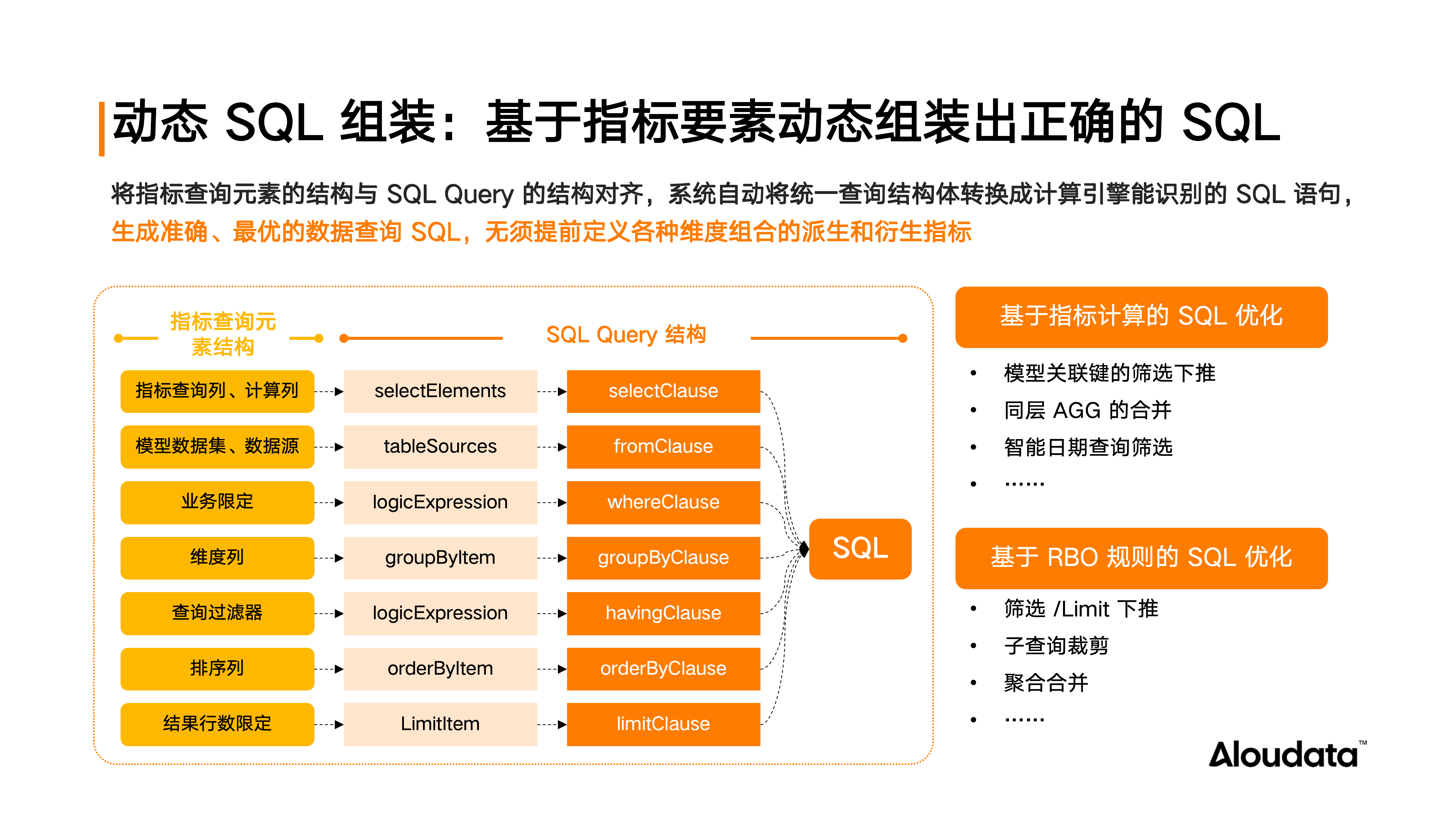 例如,SQL 中的 WHERE 对应指标元数据的业务限定,GROUP BY 对应分析维度等。在 SQL 生成过程中,还会基于指标的计算和 RBO 规则进行 SQL 优化,如合并相同层的聚合、实现智能的查询下推等。通过指标要素动态拼装出正确的 SQL,降低知识维护搭建成本,无需提前定义各种组合的派生、衍生指标,只需维护管理最原子的要素。