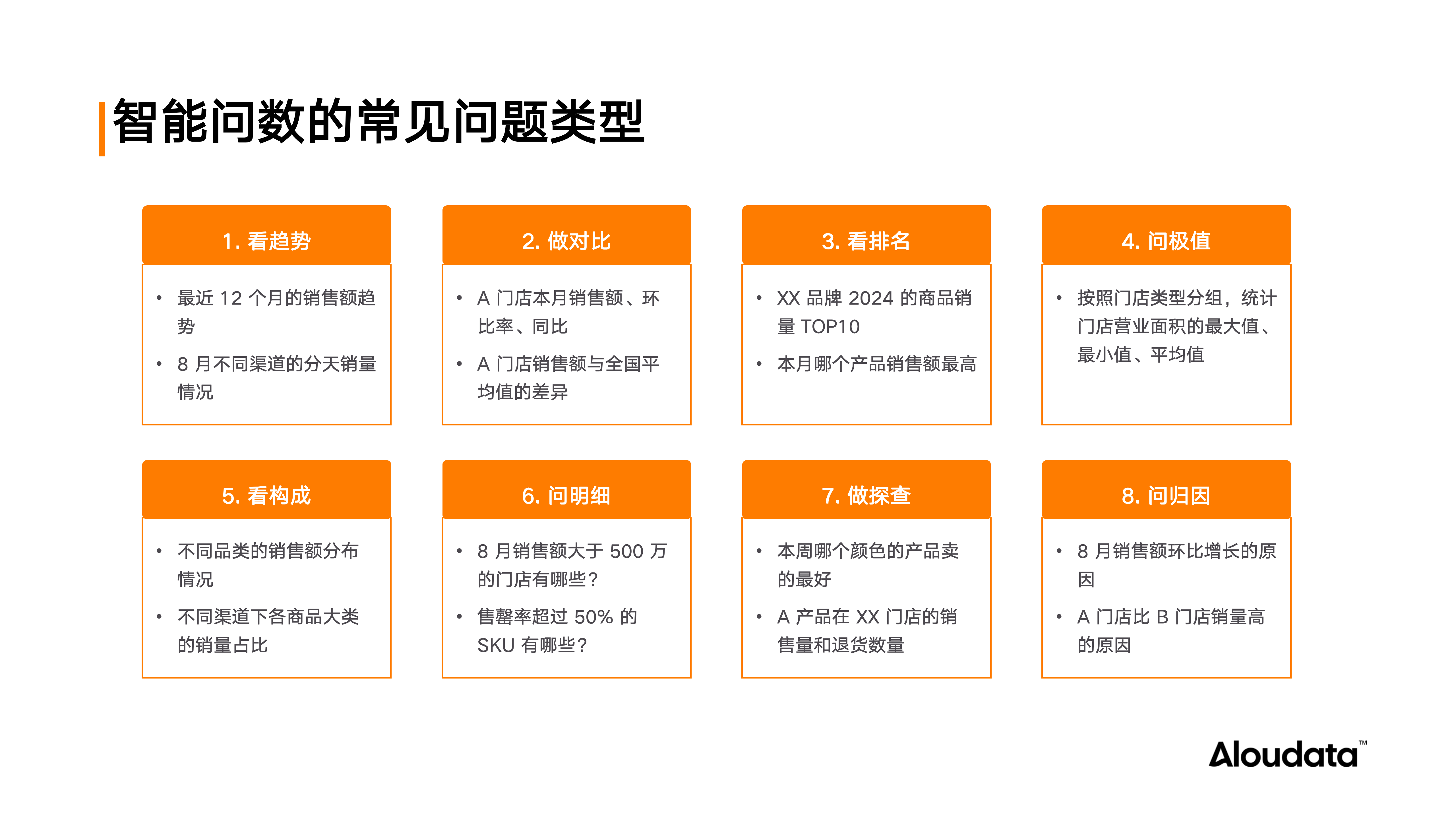 我们列举八大分析类型(包括问趋势、做对比、看排名、问极值、看构成与分布、问明细、做探查以及问归因)的具体示例,来展示 Aloudata Agent 如何实现准确的意图理解和 SQL 生成。