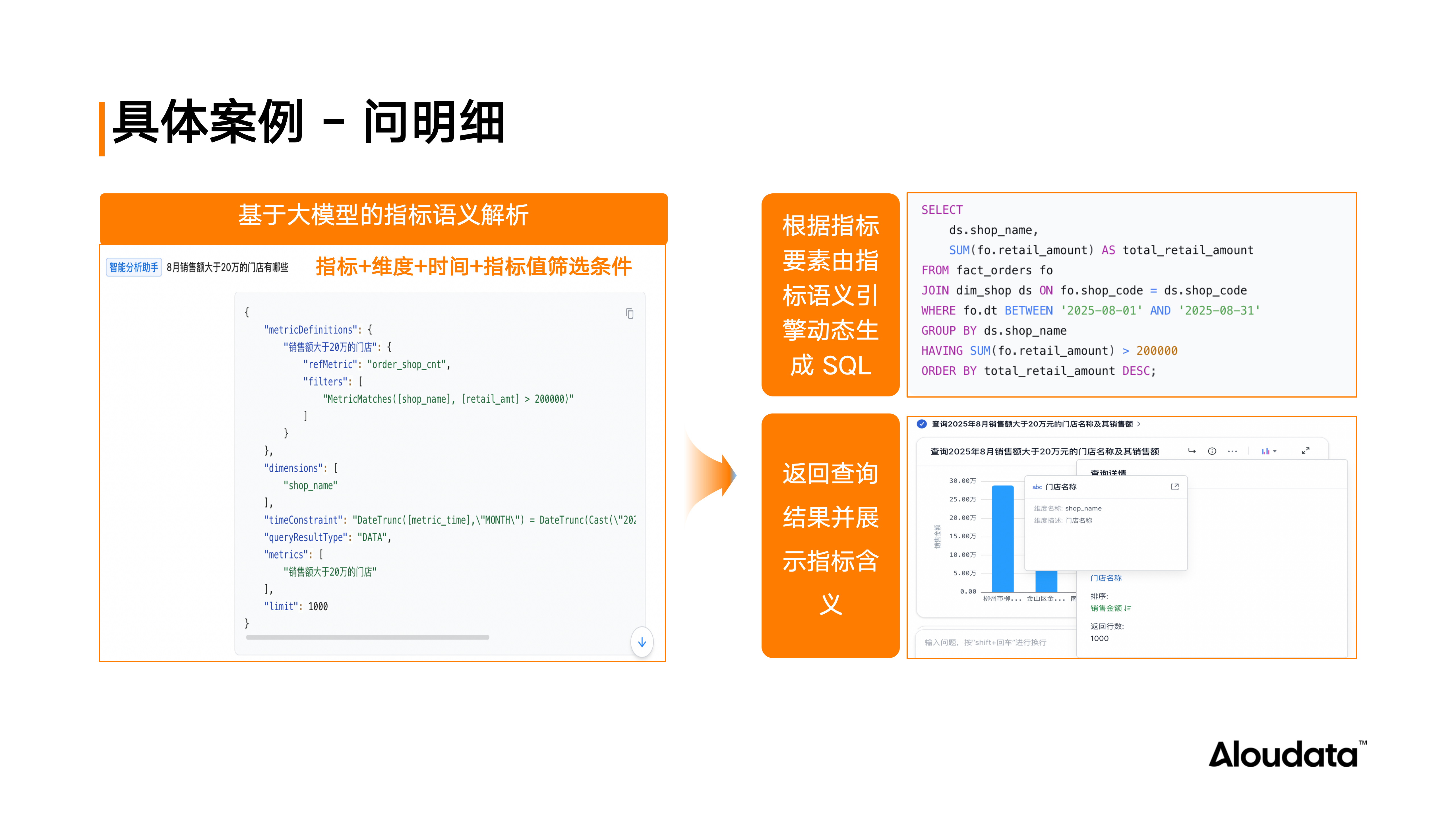 前期数仓中未对门店是否满足 8 月份销售额大于 20 万这一条件打标签。指标语义层会动态将指标转成标签,并基于指标语义函数动态生成 SQL,从而准确查询出符合条件的门店。