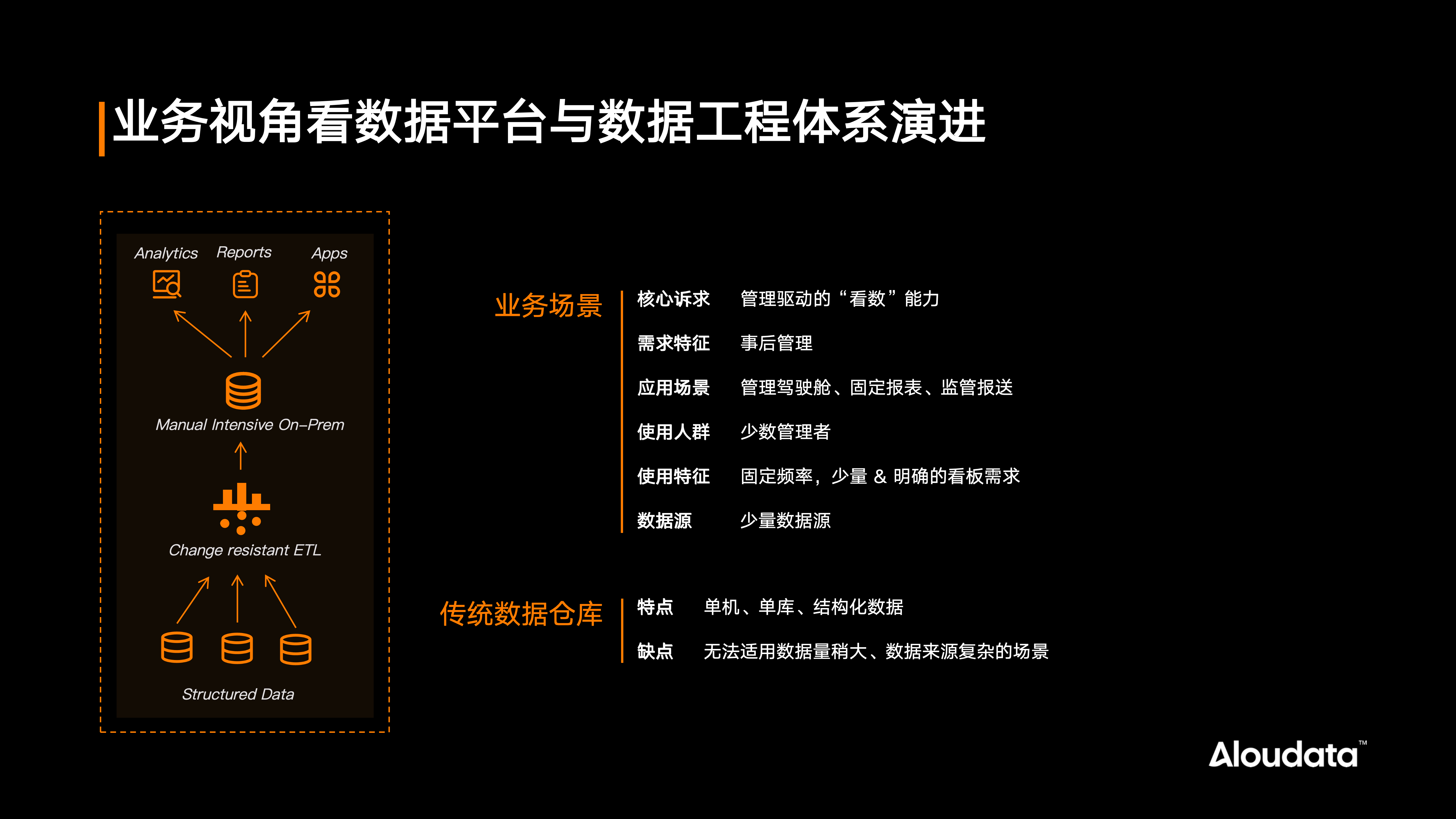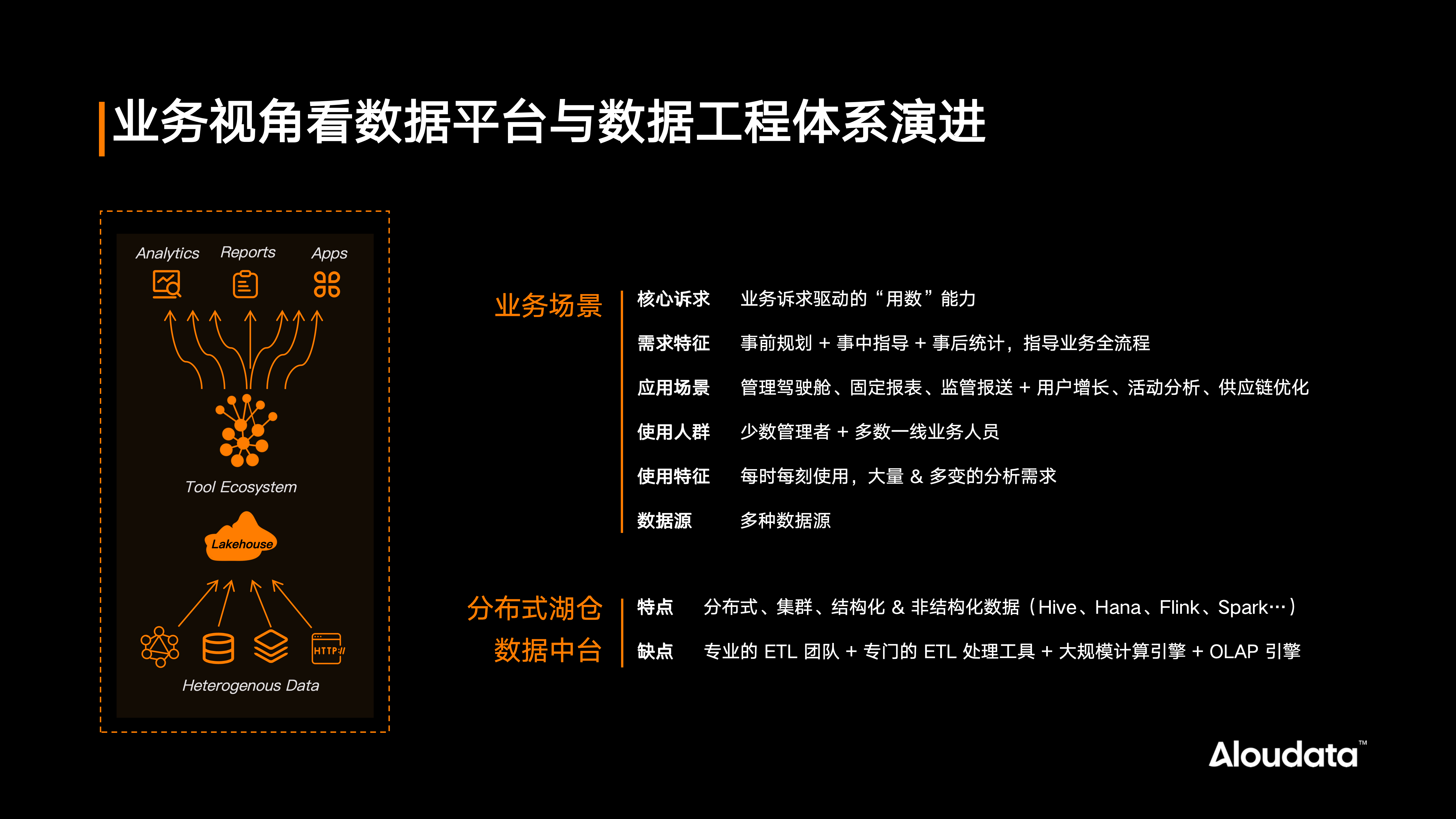 回顾数据平台和数据工程体系的演进过程,在早期信息化阶段,传统数据仓库能够很好地满足由管理驱动的“看数”需求。但随着互联网和移动互联网的快速发展,数据分析需求、数据分析人群、数据源和数据量爆发式增长,推动企业数据工程体系进入到分布式湖仓和数据中台阶段。