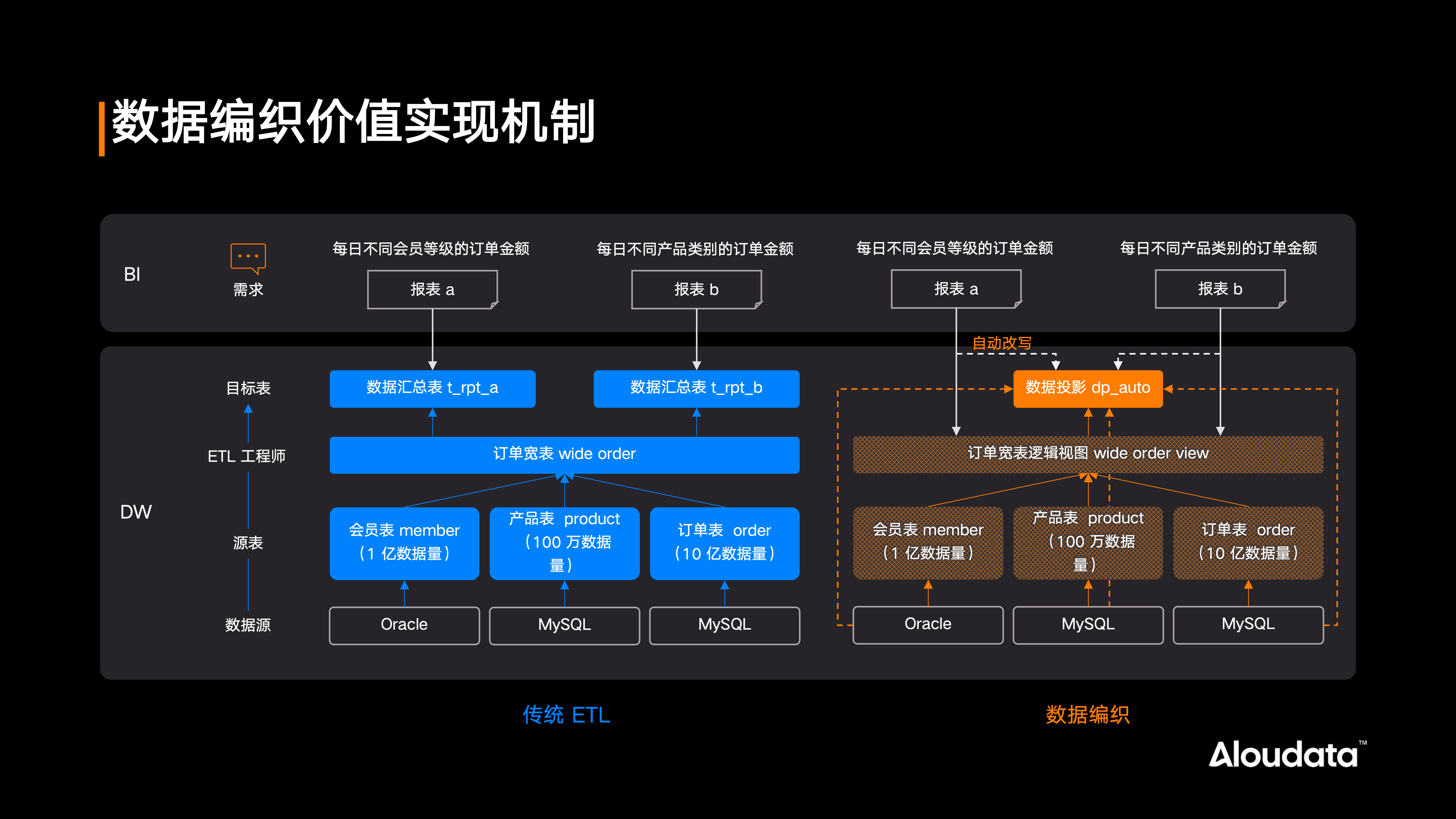 假设业务的需求是生成两张报表:一是按会员等级统计每日订单金额,二是按产品类别统计每日订单金额。在传统数据仓库架构中,需要先将散落在各数据源中的数据物理同步至数据仓库,进而构建会员表、产品表及订单明细表,随后是基于这三张事实表和维表构建订单宽表,并在此基础上进一步加工出所需指标的两张汇总表,以满足报表的查询需求。此流程涉及六个物理表的创建,以及配套的数据同步、加工、调度、运维等多项任务。