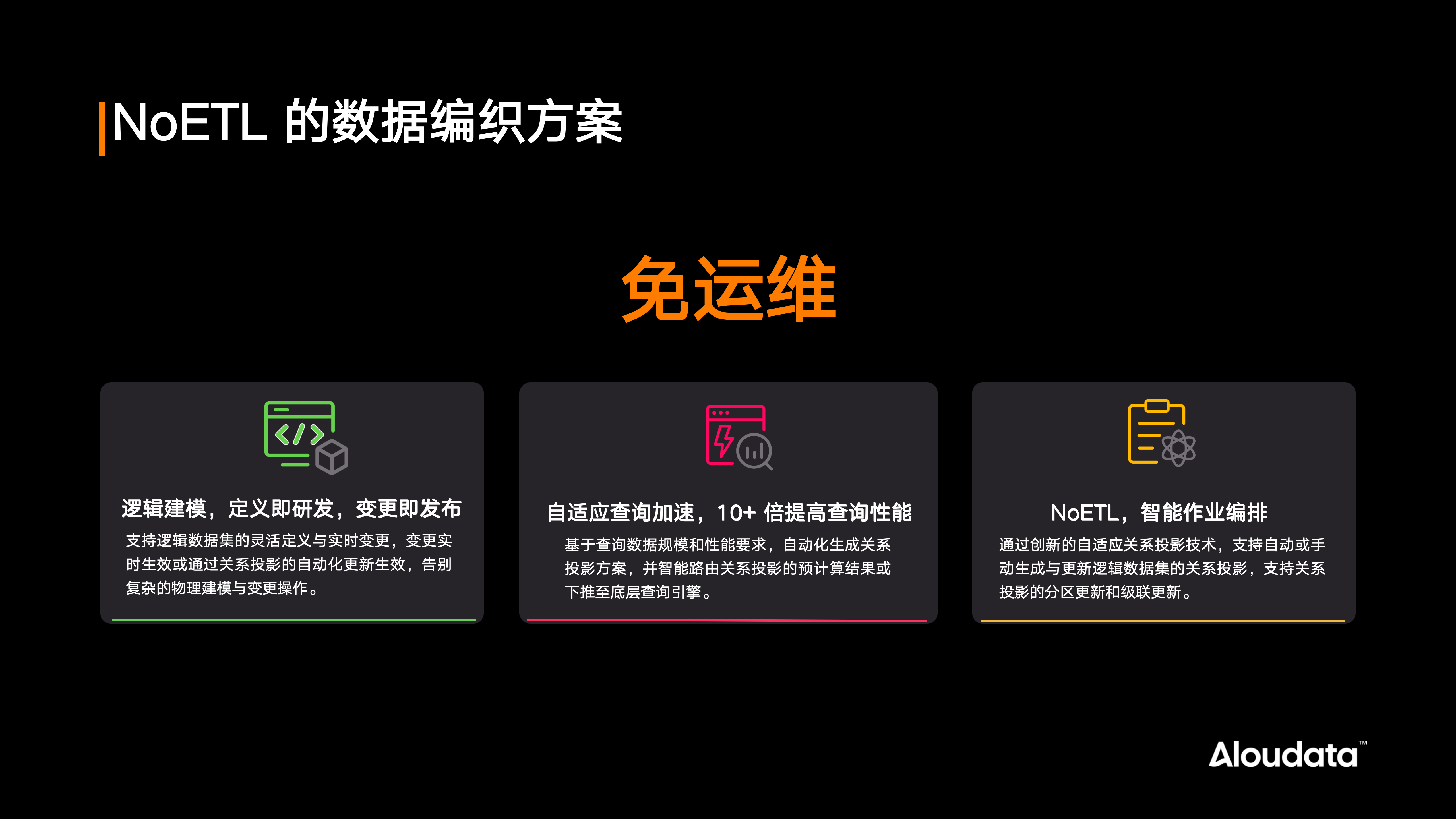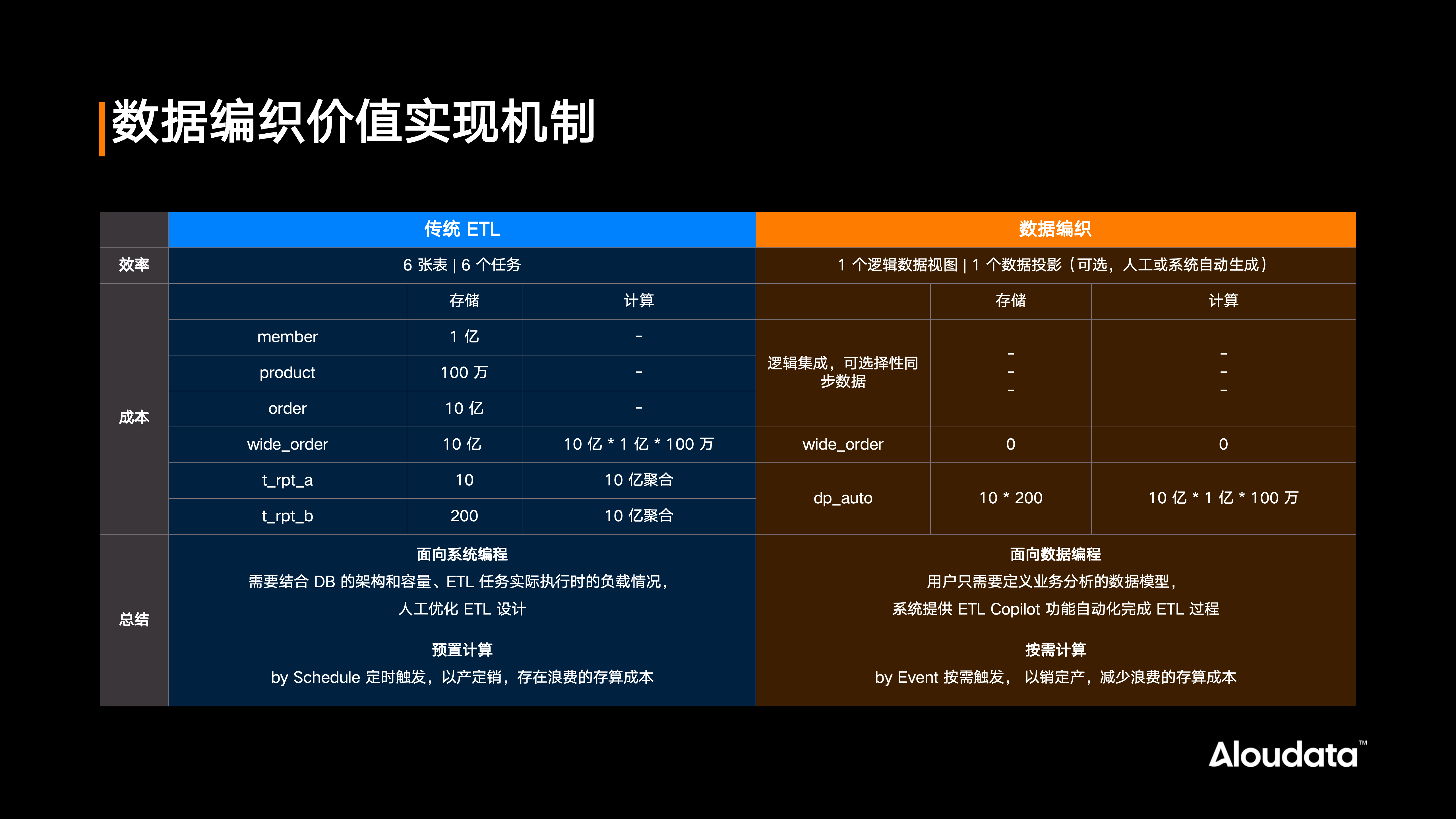 其次,数据编织显著降低了运维负担。通过查询加速、下推等先进技术,自动化处理了传统 ETL 流程中的任务配置和作业运维等环节。用户无需关注调度作业的具体执行,因为这些操作已被平台内置的加速任务所优化和自动化,从而实现了免运维的目标。此外,在模型定义层面,数据编织方案使得逻辑表的变更变得简单且高效。当表的逻辑发生变化时,下游数据能够自动生效,无需进行繁琐的数据回刷操作,这大大降低了变更过程中的复杂性和出错风险。