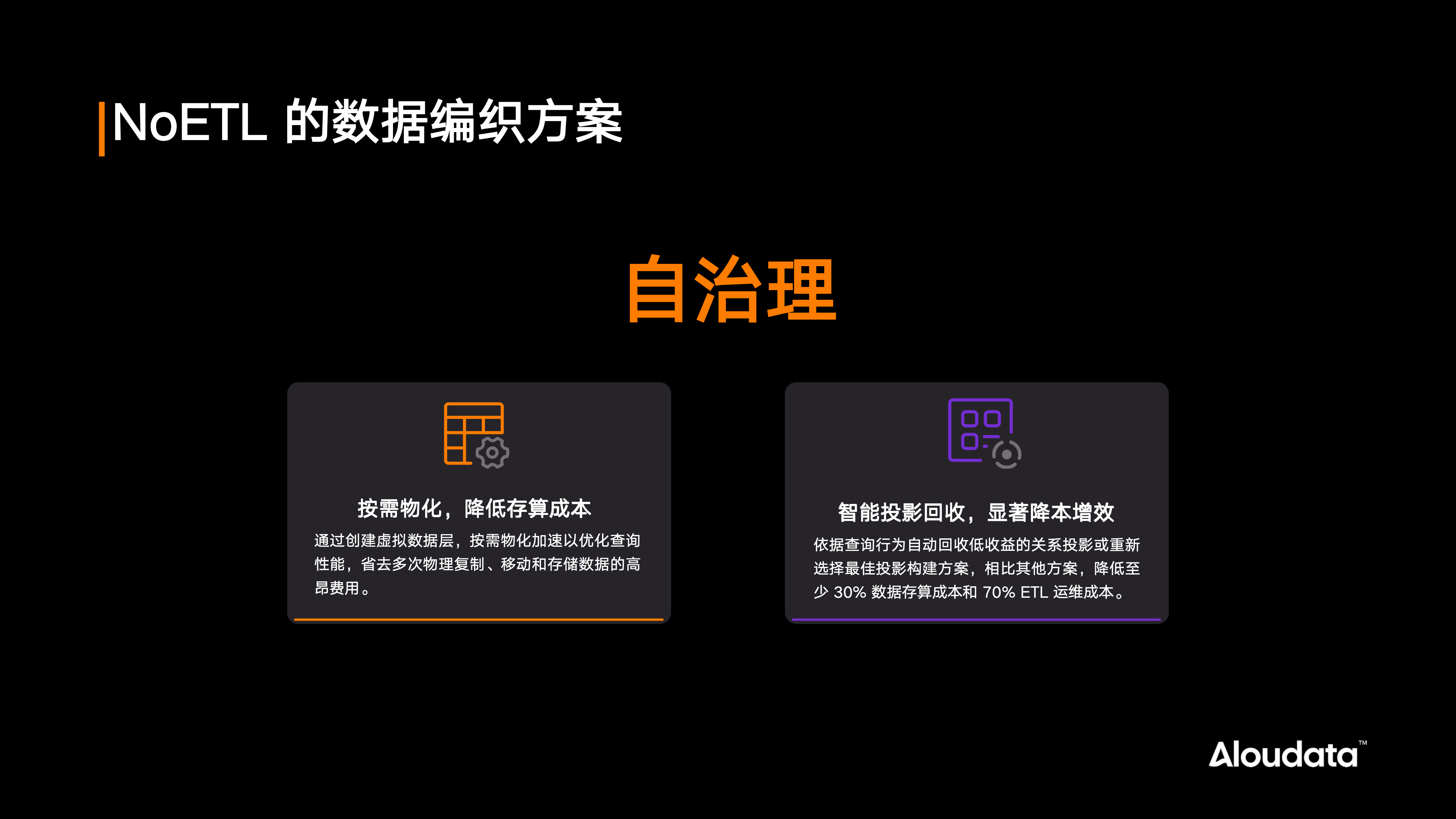 最后,数据编织还具备自治理能力。在传统数仓中,大量跑批任务的管理和监控需要耗费繁重的人力。然而, Aloudata AIR 主张按需物化特定数据,而不是全部物化。用户可以根据业务需求,在特定层级实现物化加速,从而在保证数据处理性能的同时,大幅降低存算成本消耗,并减轻了事后数据治理的压力。更进一步的,在 Aloudata AIR 逻辑数据编织平台中,生产端和消费端通过逻辑方式紧密相连,平台能够实时感知数据的消费状态。当发现加工出的数据未被消费时,平台会自动回收相应的物理作业和数据,从而有效避免了资源的浪费。
