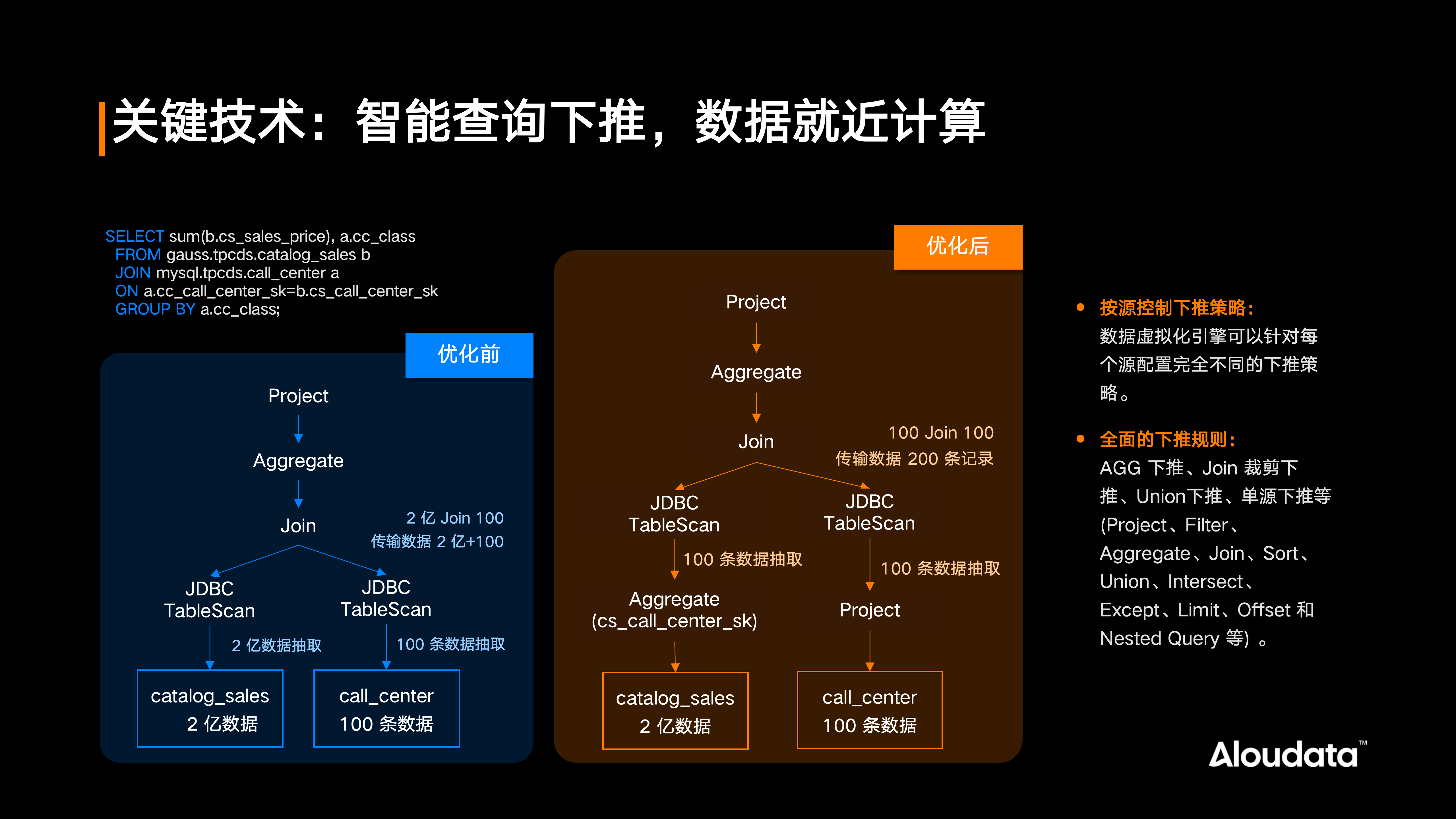 在 Aloudata AIR 中,查询下推引擎能够根据数据源特性和 SQL 算子特性,智能地将计算任务下推到数据源端执行。以 group by 操作为例,引擎可以首先根据 call_center 的 ID 在高斯数据源端进行预聚合,经过这样的优化,原本需要传输的两亿多条数据缩减至仅 100 条,极大地提高了传输效率并降低了查询成本。