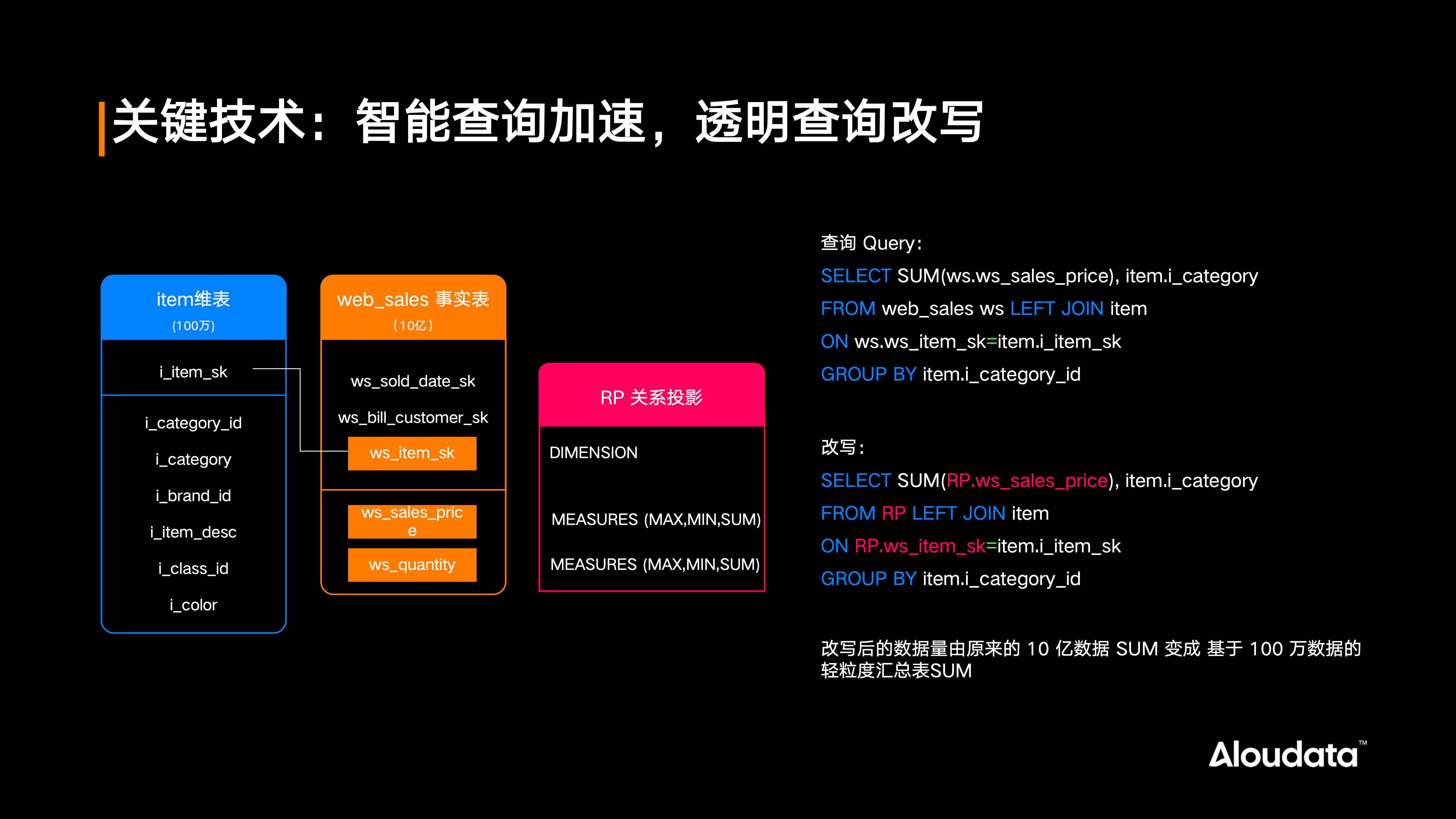 第二个关键技术是基于关系投影(RP)的智能查询加速技术,这也是数据编织不可或缺的关键能力。我们还是以一个报表场景为例,假设有一张 item 维表与一张销售事实表web_sales,如下图所示创建聚合RP: