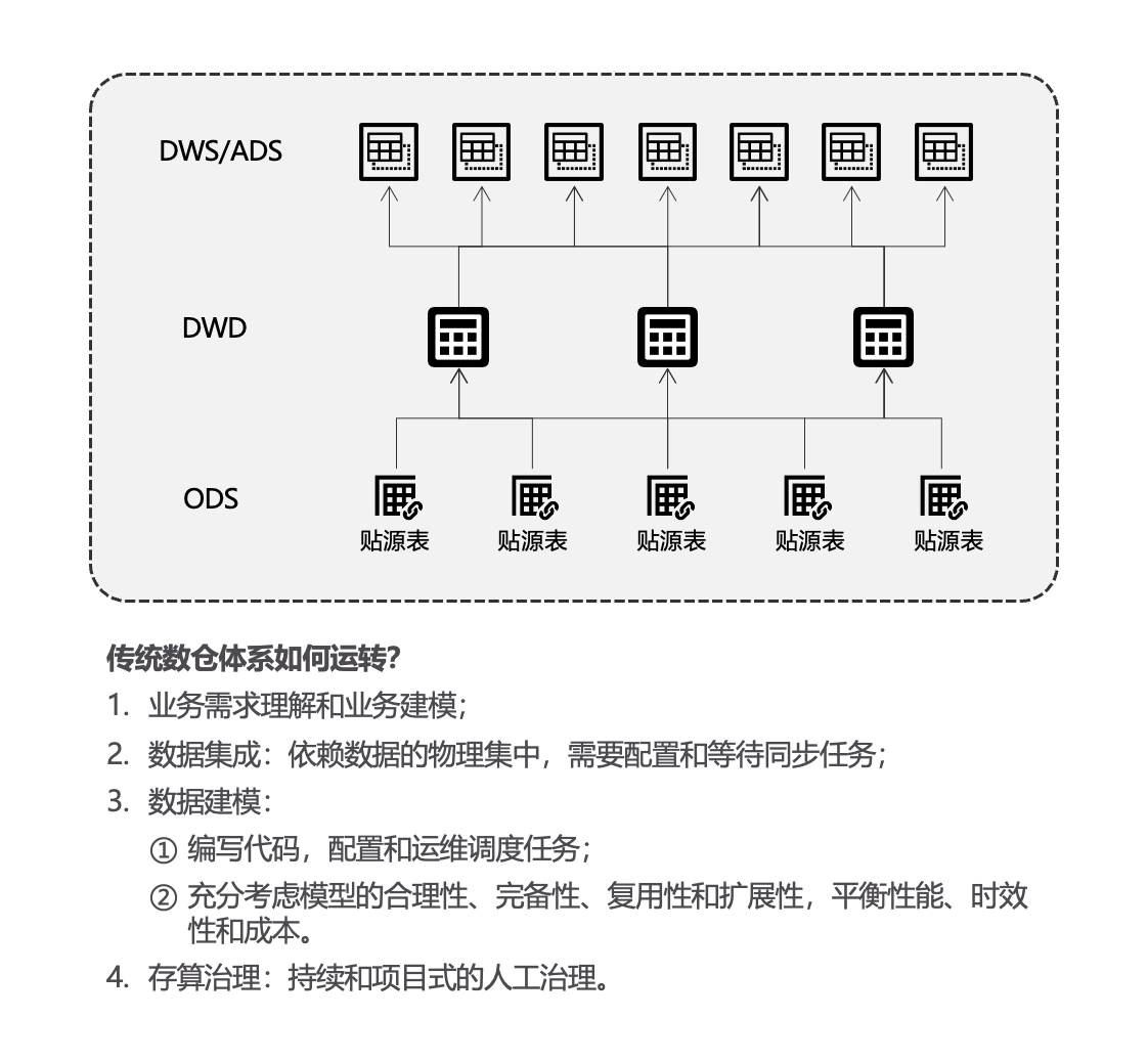 随着企业数据量、用数人群和用数场景的增加,数据团队为满足业务需求会对数据进行预打宽和预汇总(打 Cube),来确保需求响应的效率,这种用空间换时间的操作无法确保所有的预计算结果都会被真正消费,进而产生了存算资源和运维投入的浪费;即便如此,需求的持续增加会导致数据团队难以兼顾模型的复用性和扩展性,集市层表数量快速膨胀、数据口径混乱、数据链路失控是数据仓库建设 3-5 年后的通病,数据治理的负担逐渐加大。
