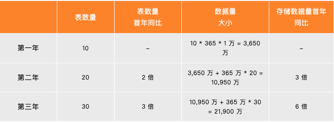 假设每年物理表的数量增长 1 倍,物理表的数量和存储数据量的增长关系可以通过如下表格体现: