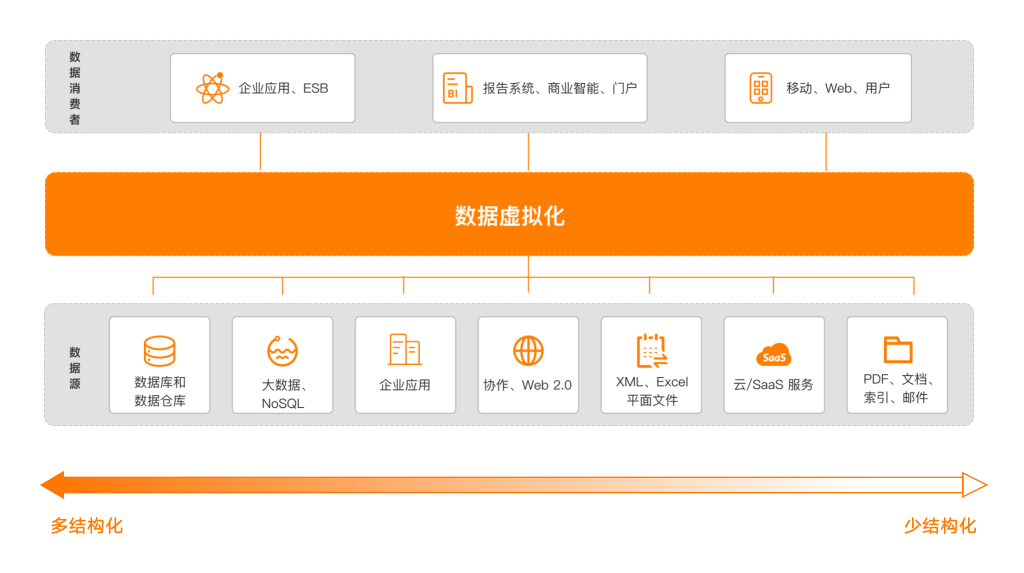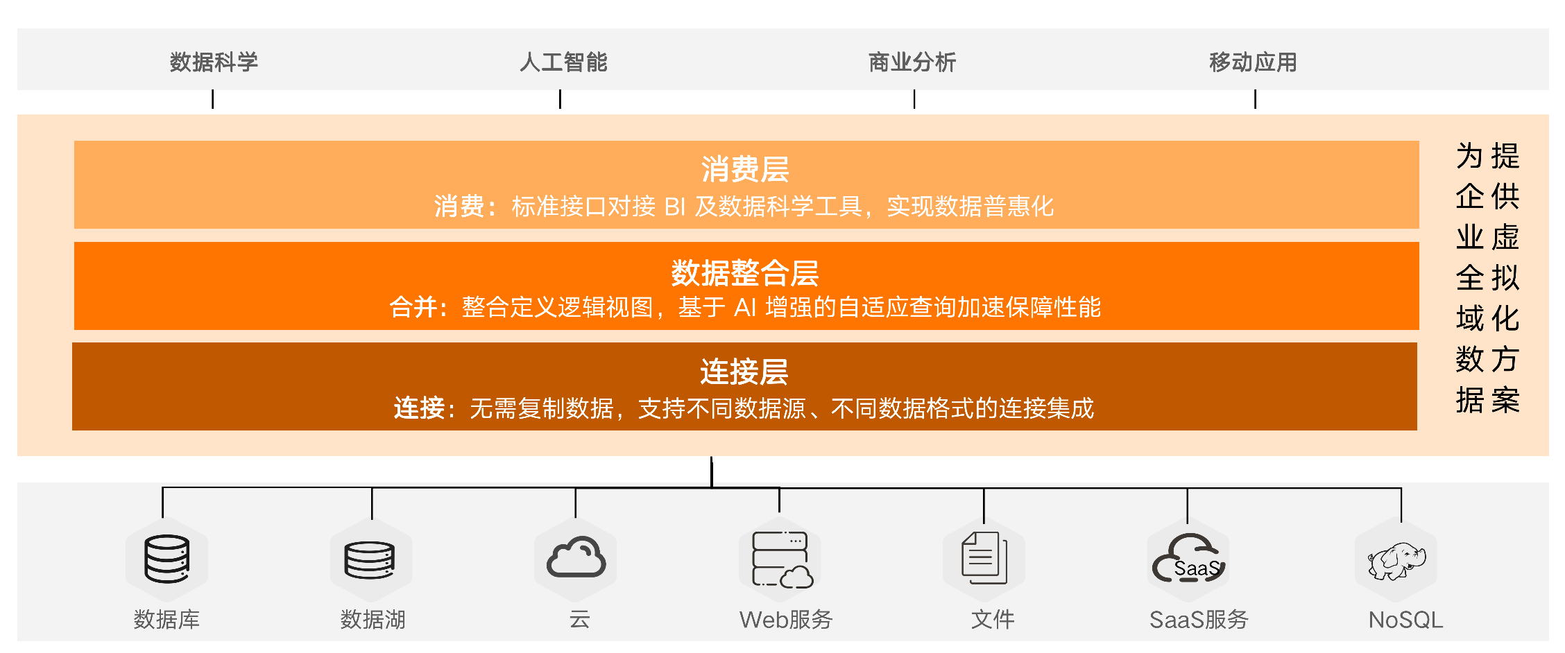 • 数据使用者:通过虚拟化层与数据交互,无需了解数据存储的实际位置和技术细节。