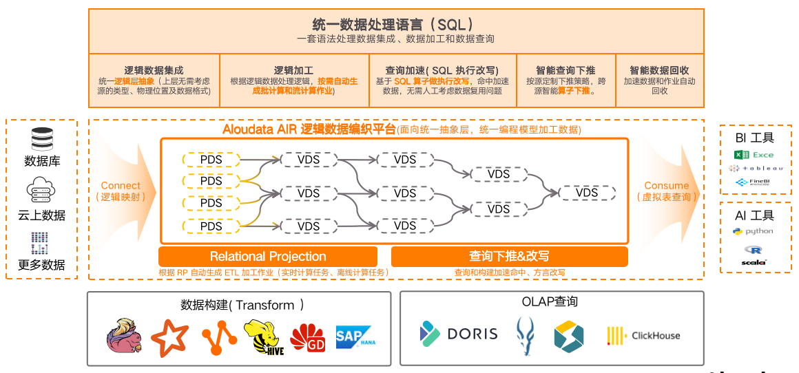 • 异构数据编织:通过统一的 SQL 查询能力实现对异构数据源的整合,类似于 Presto、Trino、Spark 等跨源查询引擎。数据虚拟化引擎在连接层统一集成各类数据源,并通过标准化的 SQL 接口提供跨源查询和数据处理功能,使用户能够高效访问和操作多种数据类型而无需关注底层存储细节。