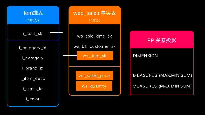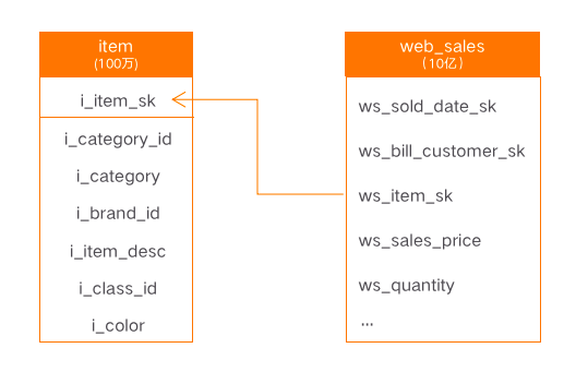 在大数据分析场景下,我们经常会存在基于事实表(web_sales)和维表(item)进行关联的数据分析统计查询场景,例如: