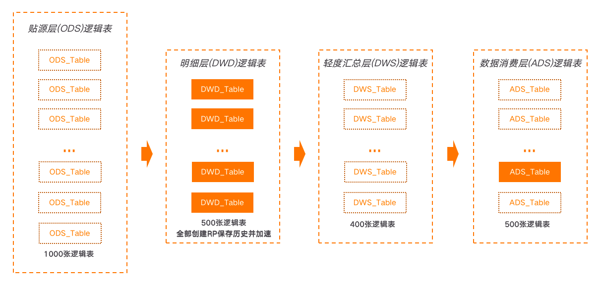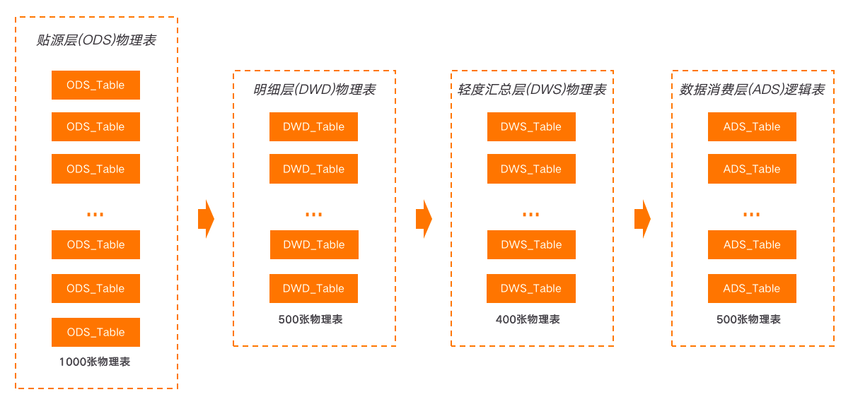 • 通过逻辑化后的按需物化可以节省哪些成本? 那么,同样的分层资产建设,假设 ODS 层有 1,000 张表,DWD 层 500 张表,DWS 层 400 张表,应用层 500 张表(我们以客户刚建设数仓第一年的状态来假设数据,实际的情况是,随着数仓使用时间的增加,一般应用层的表数量往往会极度膨胀),那么传统数仓中我们需要建设:1,000 + 500 + 400 + 500 = 2,400 张物理表及其对应的调度任务。如下图: