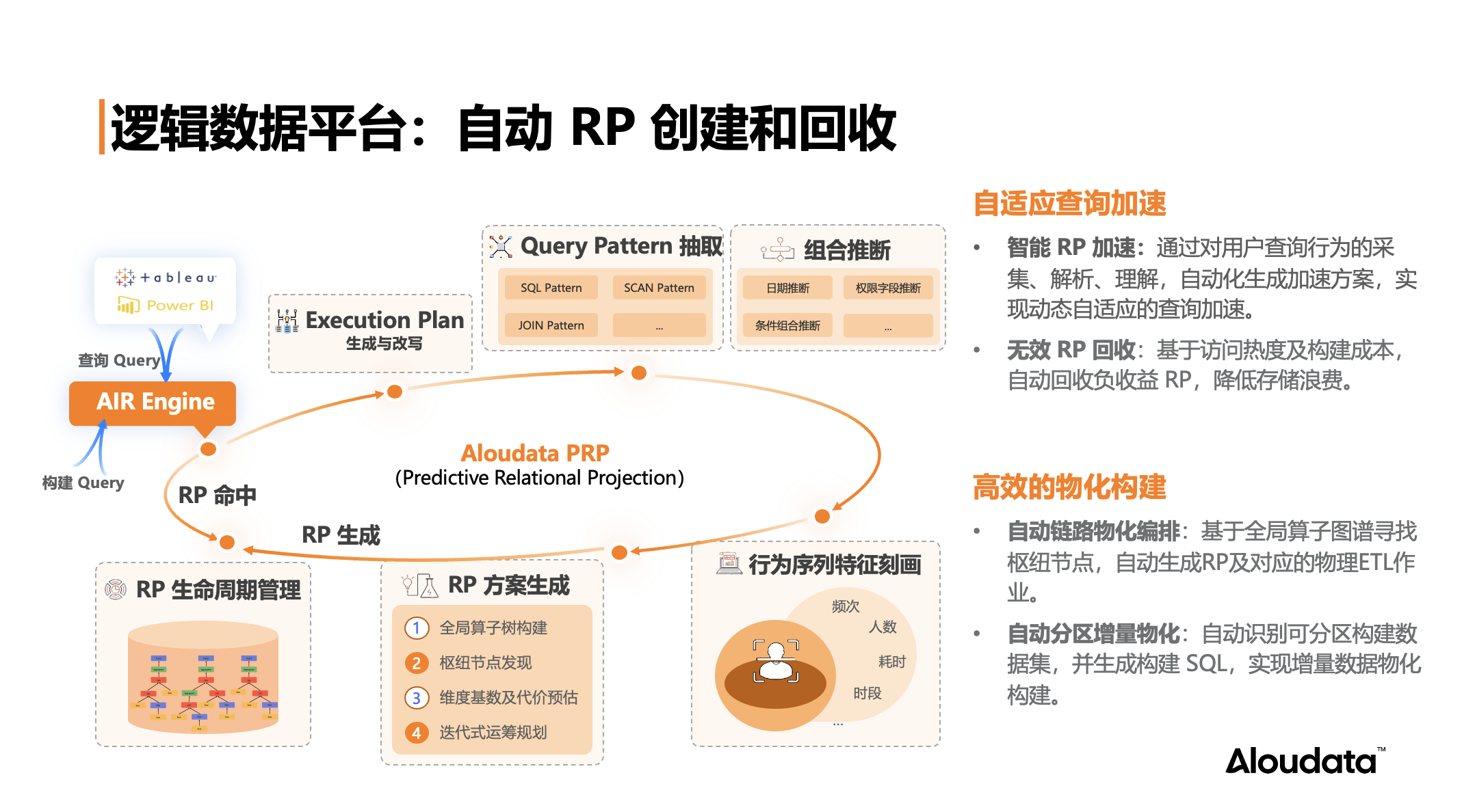特征刻画又分为两个维度:一个是基于用户查询目标表维度,比如用户查询的是哪一张或哪几张表的集合;另外一个是查询所需的数据维度,例如哪些频繁使用的数据范围会被包含在内。基于这两个维度,AIR 的虚拟化引擎将生成相应的 RP 创建策略。有了这些 RP 策略之后,策略执行引擎会自动创建背后的 RP,后续查询或构建作业就可以利用这些 RP 生成的物理数据,优先从这些预先计算好的数据返回查询结果,从而提升用户查询和构建的性能。