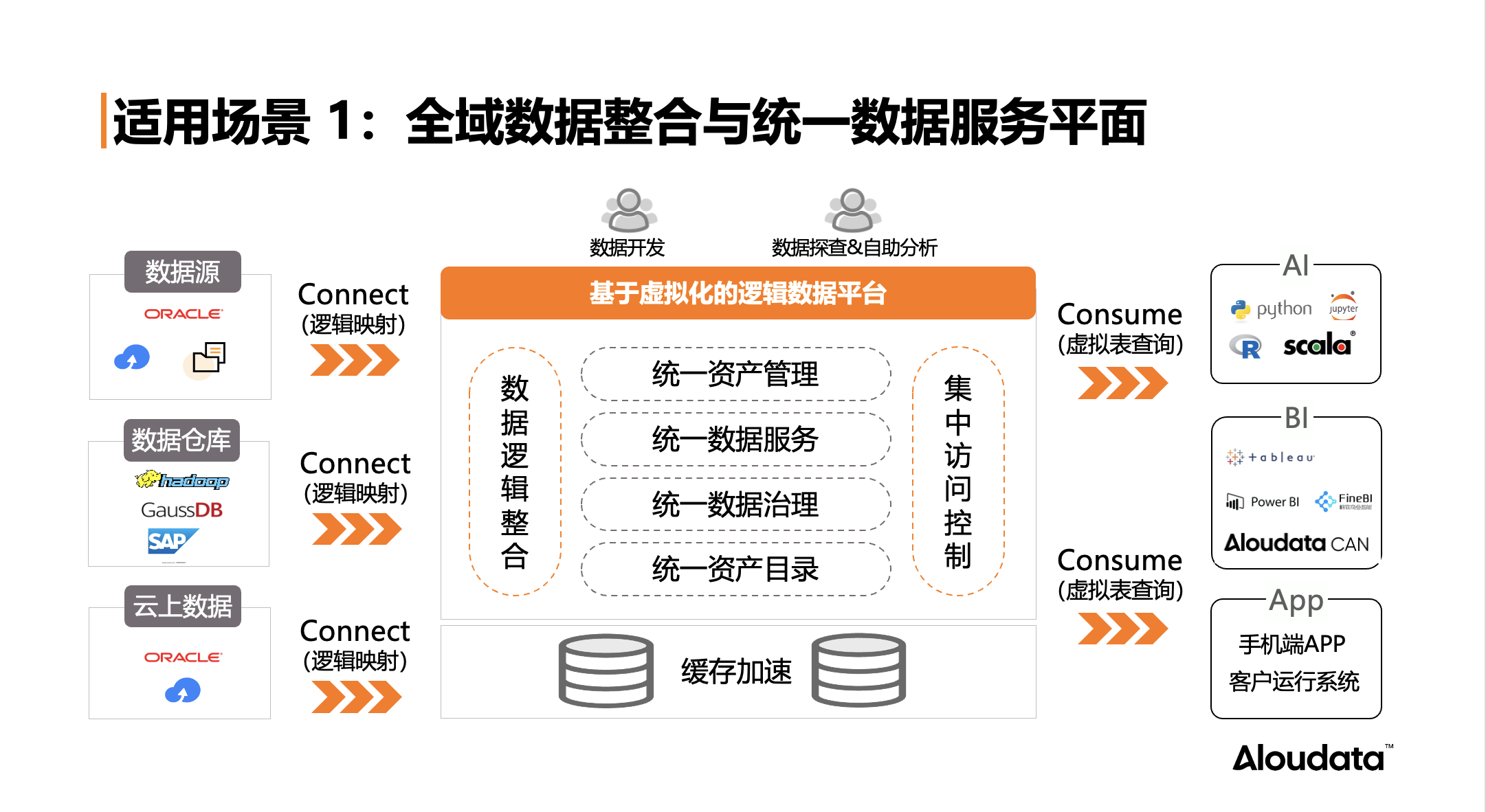 第一种, 针对中大型企业,特别是那些拥有多元化数据存储资源(如数据仓库、数据湖以及分布于分子公司和混合多云平台的业务系统)的企业场景,我们提供的逻辑数据平台与虚拟化技术相结合的解决方案能够实现关键性突破。此方案将企业的离散数据在逻辑层面高效整合,以极低的成本沉淀全域数据资产并提供统一的数据服务。这样不仅集中满足了所有数据消费场景的需求,还实现了统一的数据访问控制机制,开创了一种全新的数据整合模式,充分展现了虚拟化技术的核心优势。