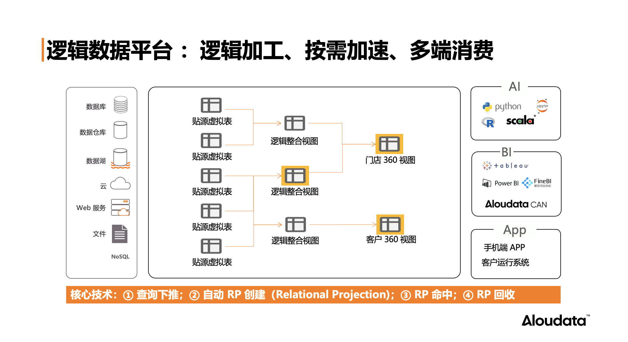 第二项关键技术是自动化的 RP 创建与回收(RP - Relational Projection,一种将视图和物理 ETL 作业进行关联的对象)。实际场景中,并非所有视图都需要创建 RP。逻辑数据平台下面的虚拟化引擎,会自动(或者人工)为需要的视图创建 RP,在 RP 长时间不被使用的时候还会进行资源回收。这个技术相较于传统 ETL,能够在存储和计算资源上实现显著的成本节约。