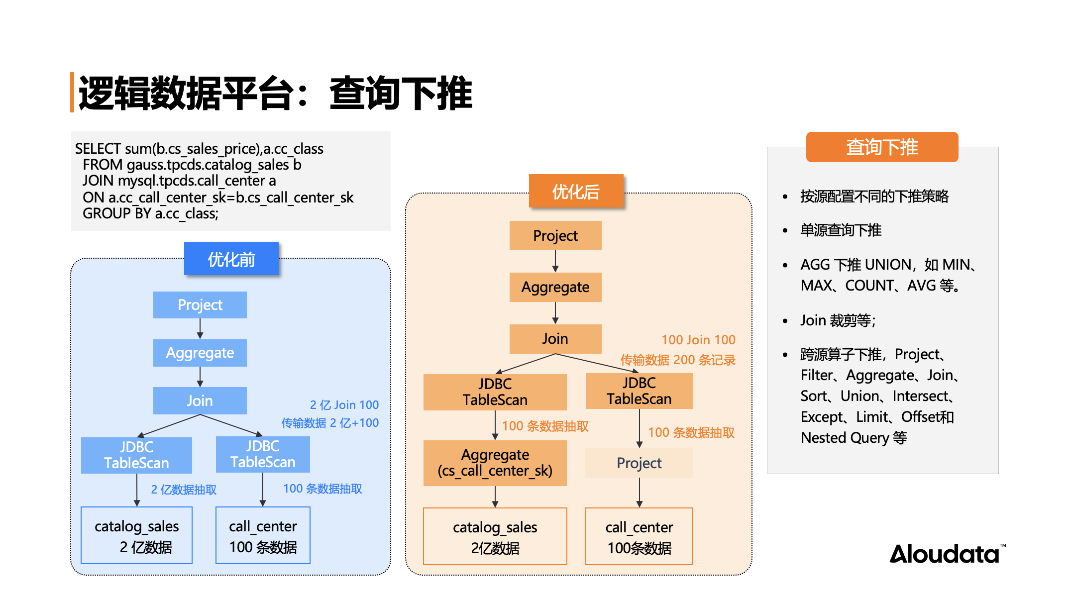 其次,在某些情形下,甚至整个查询都可能在数据源端完成。除了这些常规下推能力外,我们的虚拟化引擎还实现了更多下推操作,比如聚合(AGG)下推、联合(Union)下推,包括跨源 join 裁剪等,这些都是传统的跨源查询引擎往往不具备的能力。