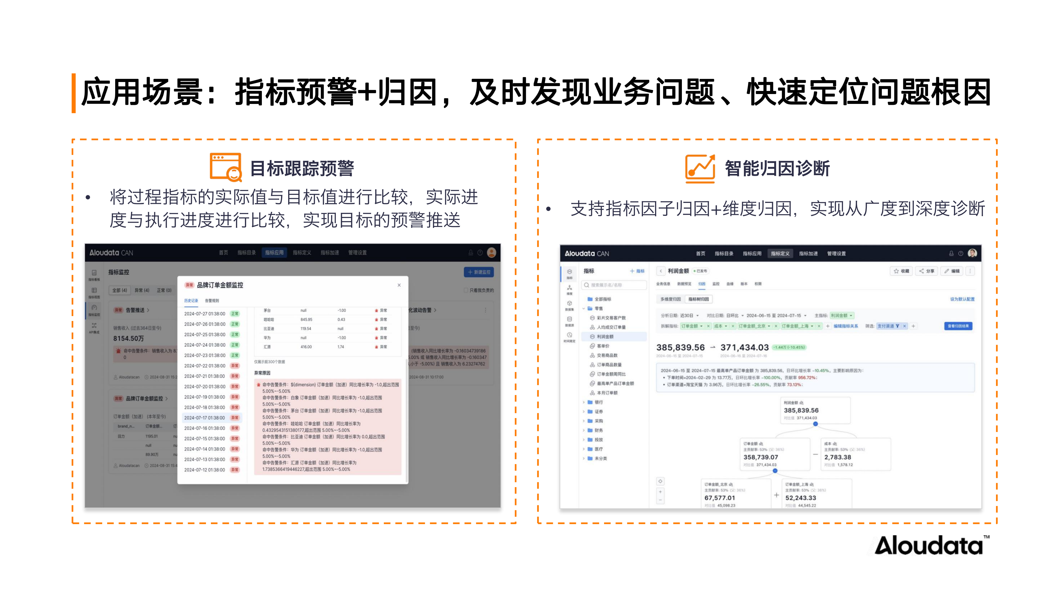 基于指标树,企业可以实现从战略目标到业务执行的闭环。然而,在执行过程中,难免会遇到结果与目标产生偏差的情况。这时,Aloudata CAN 的指标预警和归因功能能够实时跟踪目标达成的进度,一旦发现异常便立即发出预警,使企业能够及时调整策略。