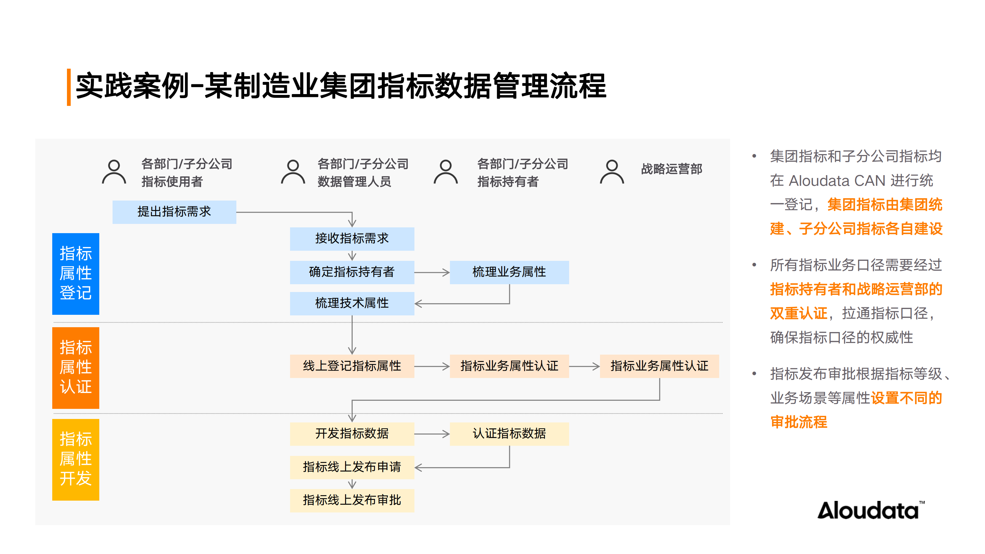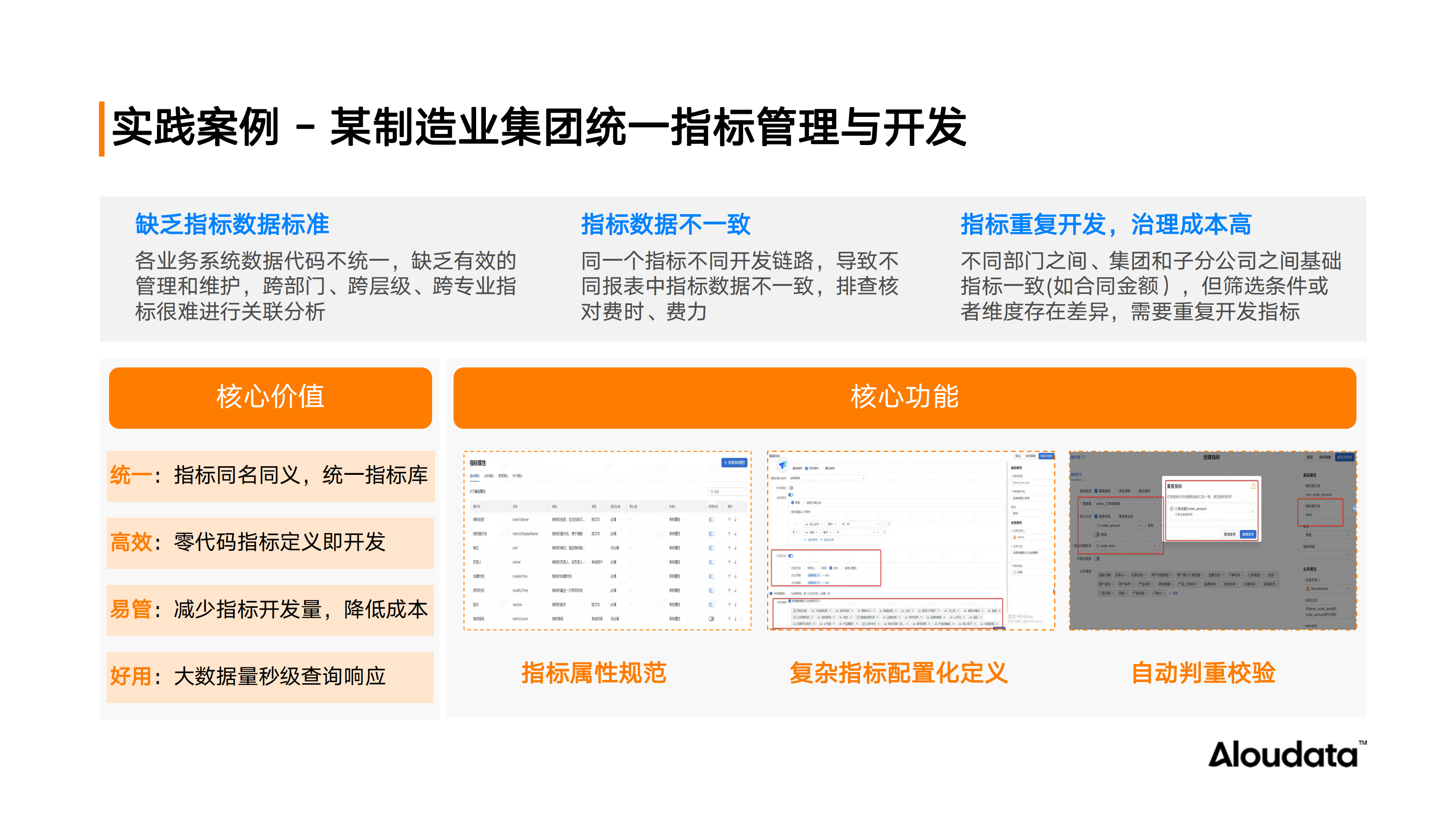 在某制造业集团的案例中,由于缺乏统一的指标标准规范,企业面临着指标不一致、重复开发以及治理难度大的问题。为了解决这些问题,企业引入了 Aloudata CAN 自动化指标平台,并结合一套科学的管理方法,实现了指标管理的规范化、高效化和业务的数据驱动。