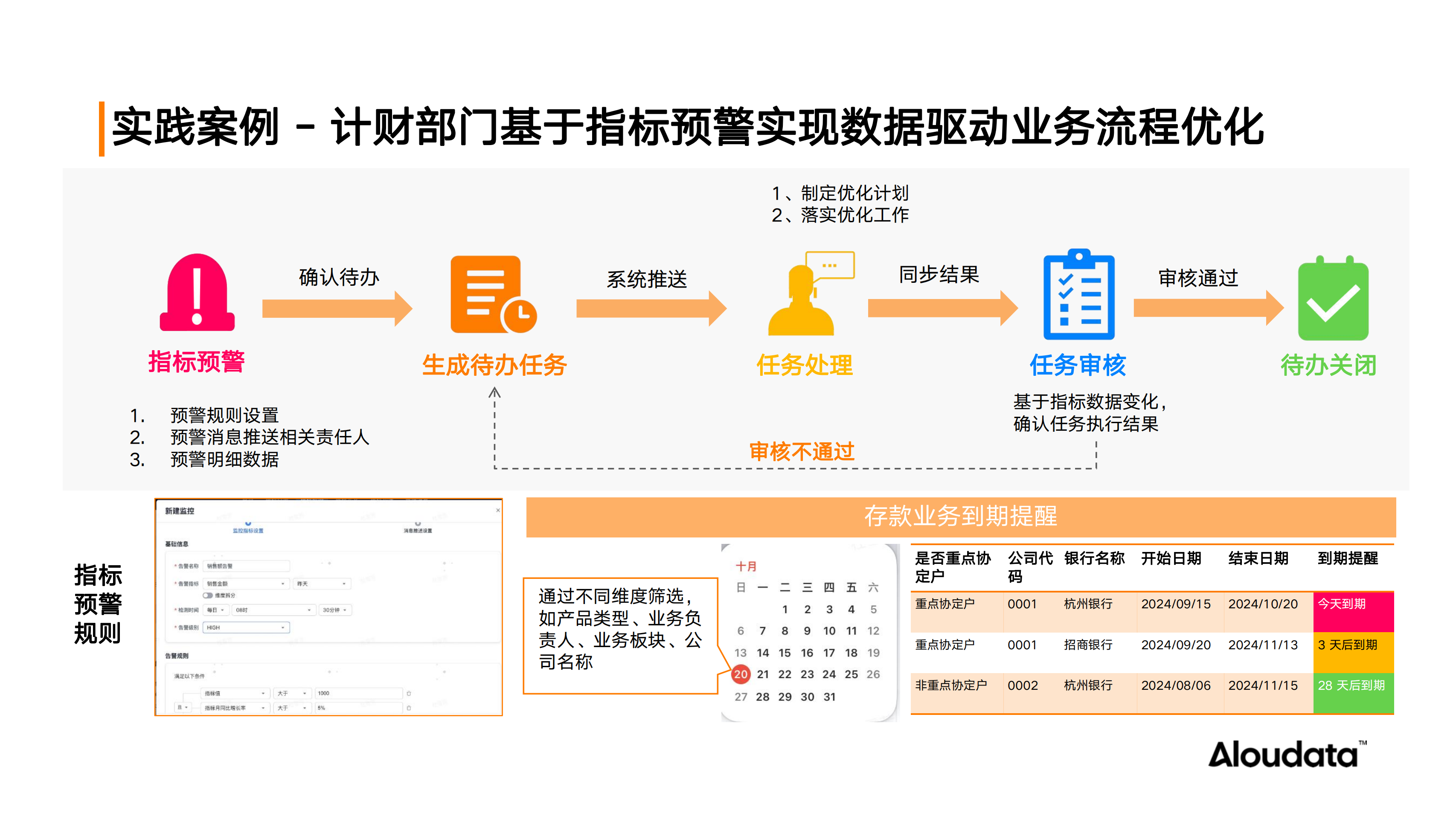 最后,指标平台更是驱动业务流程优化的重要引擎。以计财部门为例,企业通过指标平台的预警能力,将指标与业务流程紧密结合。以银行存款到期这一指标为例,平台能够根据预设规则自动分析并识别出各子分公司即将到期或存在问题的资金账户,提供预警消息,并且推送包含具体到期时间(如今天、三天后、一个月内等)的明细数据。这些明细数据与企业 OA 系统打通,直接转化为相关部门的代办任务,实现了线上化的处理和反馈流程。这不仅大大减少了线下沟通的工作量,还加快了业务流程的优化速度,实现了闭环追踪和数据驱动的数字化管理。