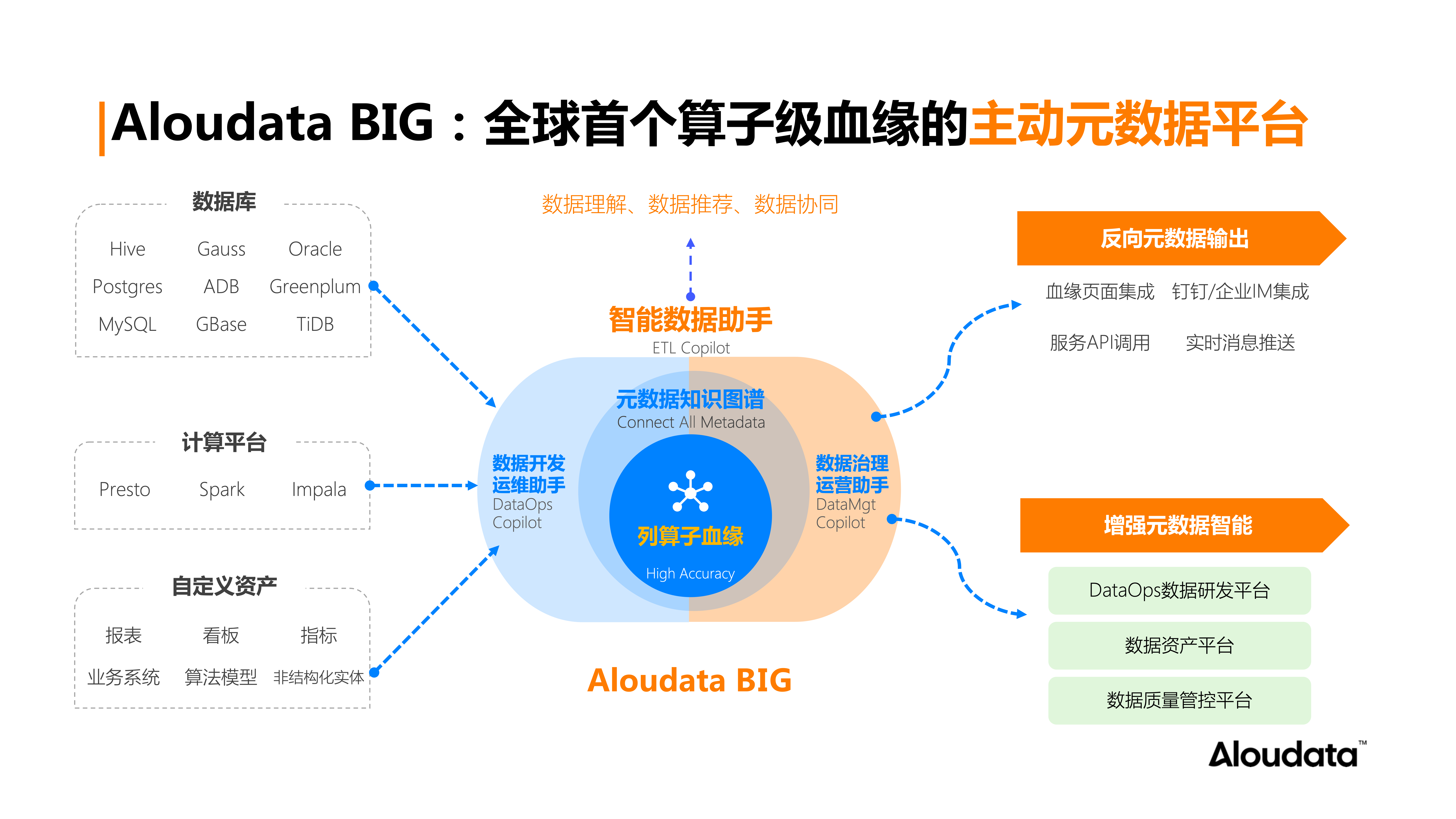 Aloudata 凭借在数据管理和技术研发领域的深厚积累,通过独创的“算子级血缘”技术,打造了 Aloudata BIG 主动元数据平台,能够助力企业自动构建端到端、跨平台、可扩展的血缘图谱,为数据管理提供自动化、智能化的强大支持,实现数据管理模式的转变,推动数据管理走向自治化的新阶段。