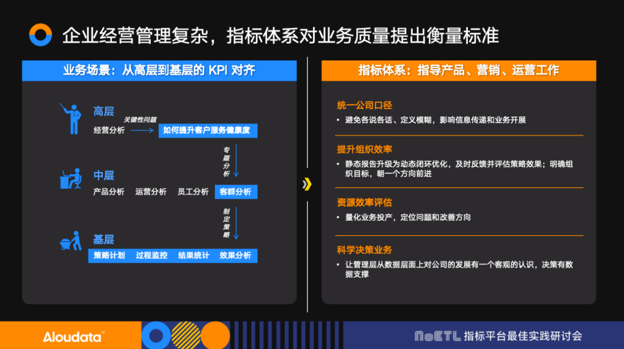 这其中,构建科学、统一的指标体系是衡量业务质量、驱动战略落地的核心抓手。指标体系能自上而下对齐组织的 KPI,将高层战略目标逐层拆解为可执行、可量化的业务动作,实现全组织目标协同。从业务场景来看,高层决策层聚焦经营分析与关键性问题解决,例如“如何提升客户服务满意度”,通过专属分析将战略诉求转化为可落地的方向;中层管理团队则围绕产品、运营、员工及薪酬四大维度展开深度分析,确保资源分配与组织效能最大化;基层执行层注重策略计划的实施与动态优化,通过过程监控、结果统计与效果分析形成闭环管理,保障执行精准度。