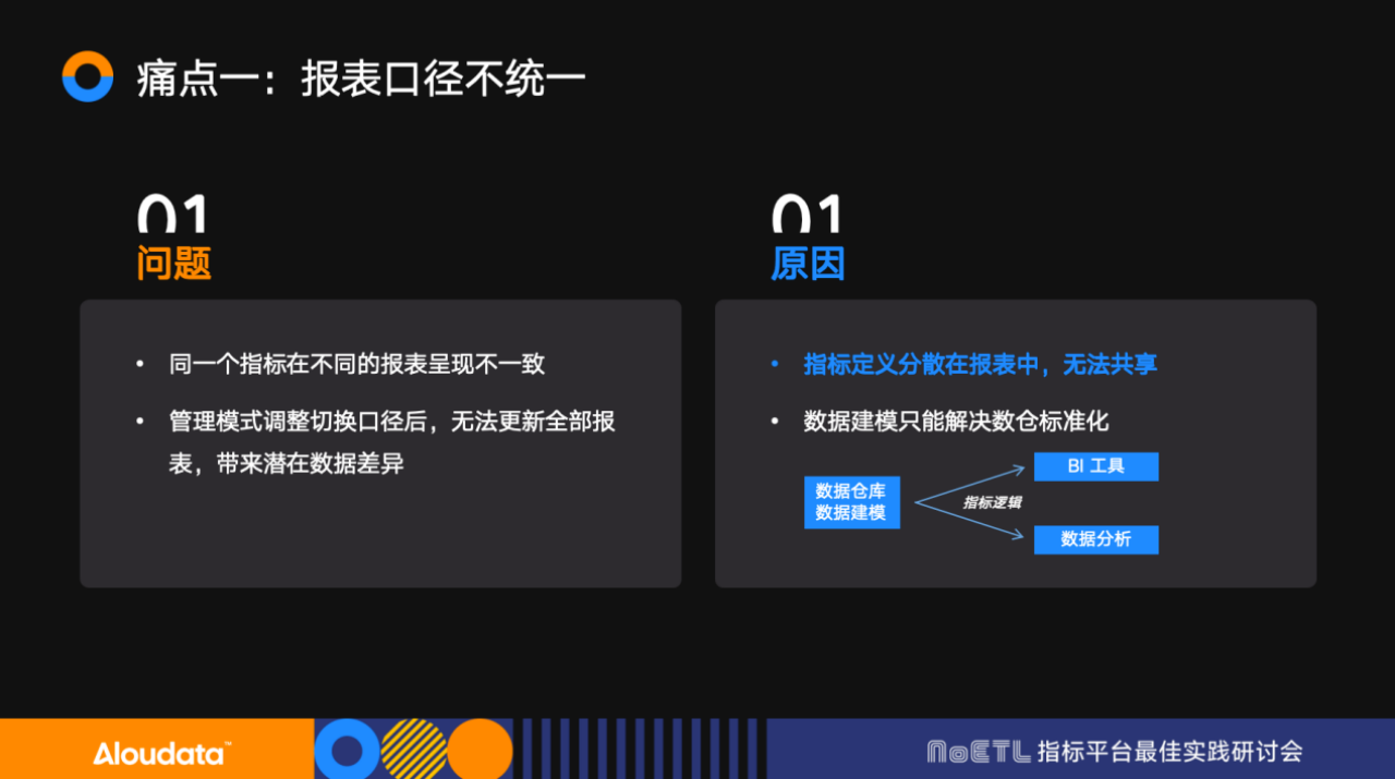 第一个较为普遍的痛点是需要统一指标口径。报表经过多年的积累,开发人员可能已经更换多轮,导致难以追溯报表数据的来源和开发逻辑。因此出现同一个指标在不同报表中的定义和计算结果存在差异,以及报表更新滞后于业务口径更新的情况,且难以解决。