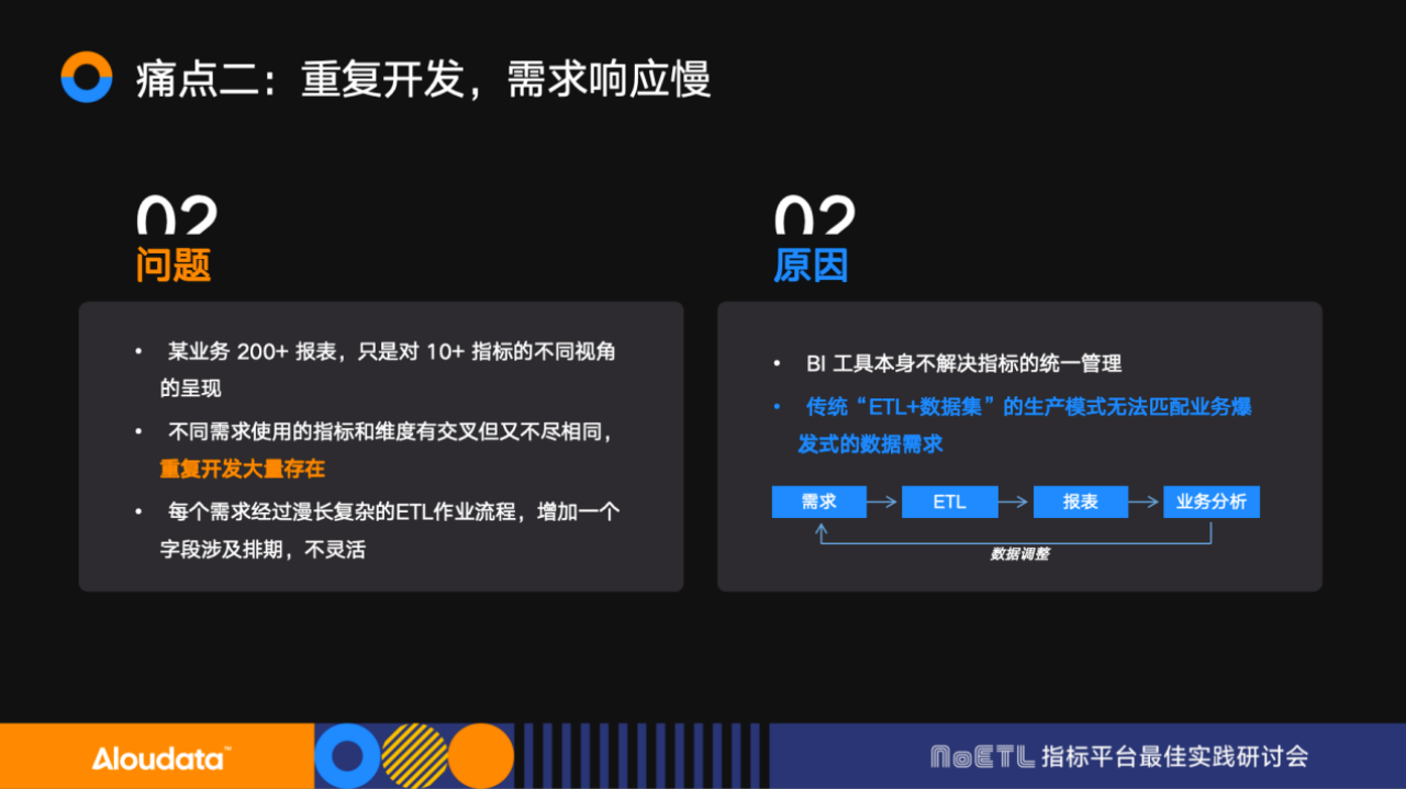第二个痛点是提升开发效率。虽然报表数量众多,但实际业务价值不明确。开发工作分散在不同团队和人员手中,加上人员变动等因素,导致同一报表可能被多次开发,而之前的开发成果却难以找到和复用,缺乏有效的管理和整合。另一方面,传统 ETL + 数据集的生产模式下,报表开发周期长,灵活性差,业务需求难以被灵活快速满足。