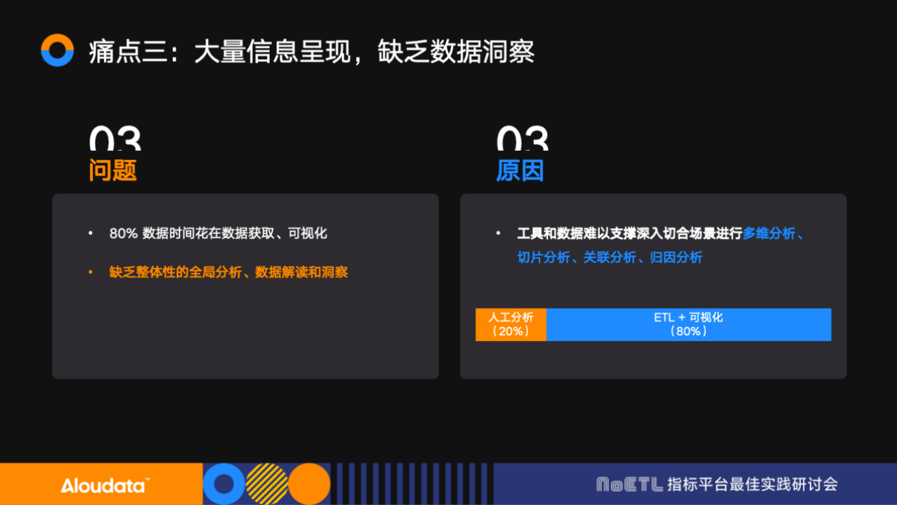 第三个痛点是亟需加强数据洞察。虽然展示数据是基础,但仅展示数据并依赖人工分析是不够的,这种方式容易受到主观判断的影响,缺乏对数据的全局解读和洞察。很多时候,我们只能看到表面的总体数据,而难以深入理解数据背后的各种维度和变化。因此,公司希望通过系统化的归因,乃至结合大模型和更多上下文信息,提供更全面的报告,从而更好地指导决策。