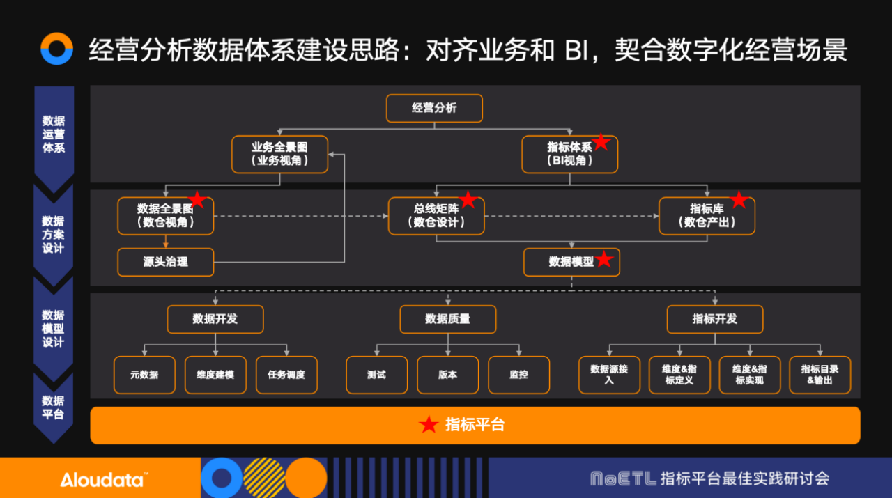 在业务线方面,我们需要将整个业务流程与数据全景图进行对应,确保业务逻辑与数据逻辑相匹配。同时,要从指标层面进行指标库和数据仓库的拆分,并将这些指标统一在一个系统中落地,以及建立相应的机制来保障数据开发的效率和数据质量的可靠性。