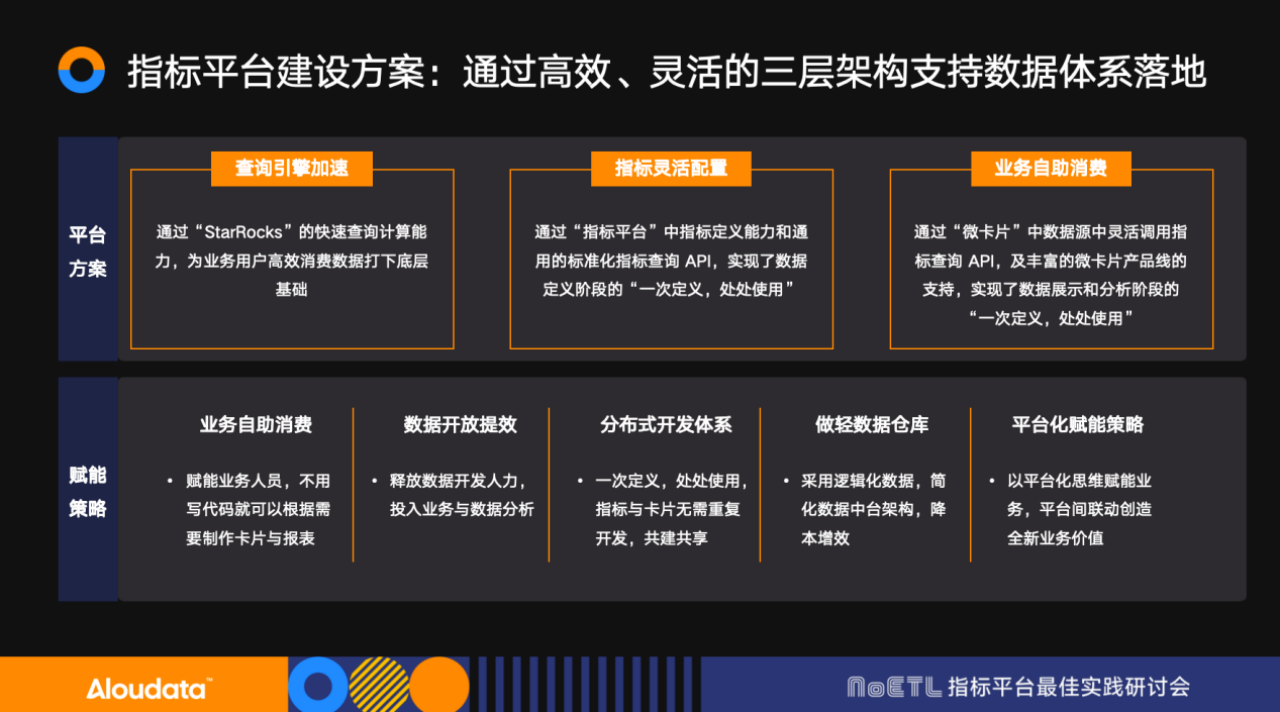 五是平台化赋能策略,可以将可复用的组件,如指标、微卡片等,通过平台化方式提供给业务部门。这些平台之间相互联动,例如指标平台与微卡片平台的紧密结合,共同构成了公司指标平台的整体架构,从而实现对业务的高效支持。