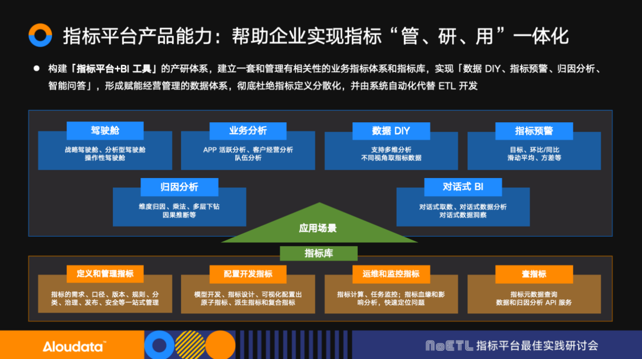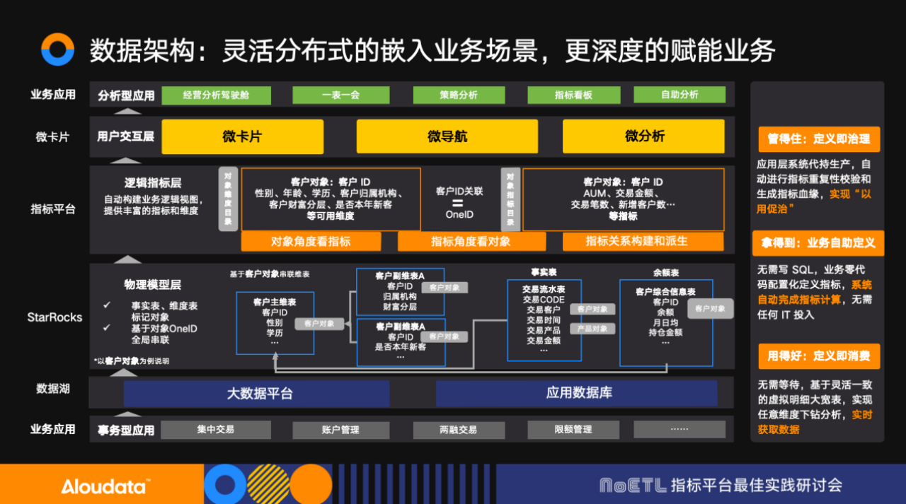 第二层是指标灵活配置层:通过 Aloudata CAN 指标平台的指标定义能力和标准化的 API,实现了指标的“一次定义,处处使用”。Aloudata CAN 的 NoETL 物化加速机制结合高效的计算引擎,能够确保指标和维度的任意灵活组合能快速实现查询结果的返回,代持了传统的宽表开发,显著降低数据开发的成本。同时,它还能让业务人员更清晰地了解指标的定义,并在流程上实现对指标的管控。