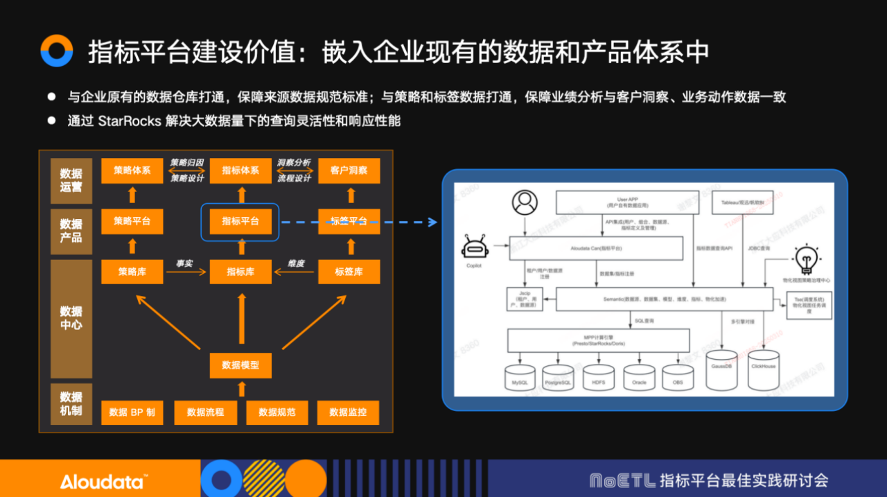 指标平台的建设具有重要价值。它采用开放式架构,嵌入到公司现有的数据和产品体系之中,并与原有数仓打通,成为公司数据体系中的一个非常重要的引擎。我们可以看到,指标平台与公司的策略平台、标签平台等实现了交互,这样一来,能够确保业绩分析和客户洞察、业务动作数据的一致性。此外,在引入指标平台的过程中,我们还通过与 OLAP 引擎的结合解决了大数据量下的查询灵活性和响应性能问题。