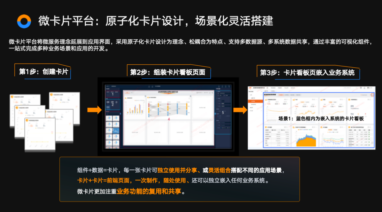 这个是刚刚提到的“微卡片”平台,它实现了与指标平台的数据源打通,能够获取指标平台的数据源,进行卡片配置和组装,并将这些卡片嵌入到各种业务系统中,从而提升数据的共享和复用能力,进一步支持业务的灵活展示和分析需求。