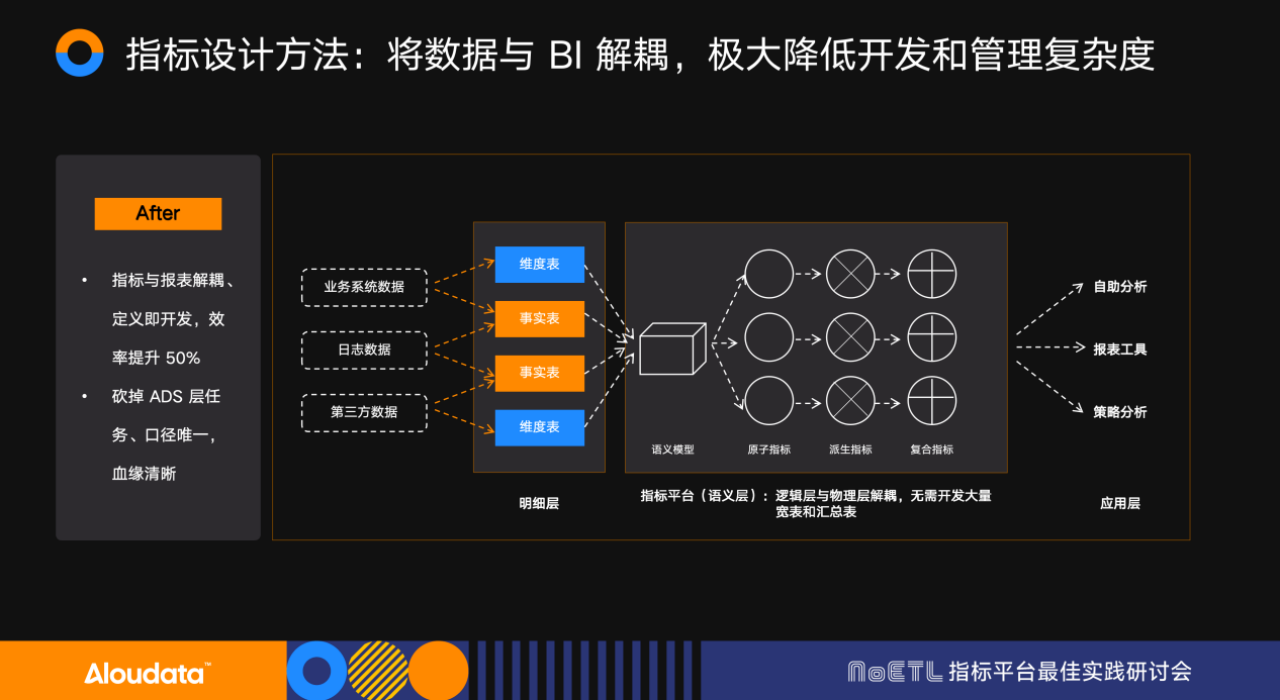 过去的数据仓库开发模式是从最原始的数据开始,通过 ETL 操作将数据逐步加工,先到 ODS 层,再到 DWD 层,最后汇总生成各种宽表和汇总表,以支持业务分析。然而,这种模式导致了重复开发、口径有差异等问题,这些问题主要集中在宽表和汇总表的爆炸式增长阶段,造成了混乱。引入指标平台后,公司通过系统化的管理方式,利用语义模型进行约束,并采用原子指标、派生指标、复合指标的架构,规范化管理指标,将数据口径与 BI 解耦,极大降低开发和管理复杂度。
