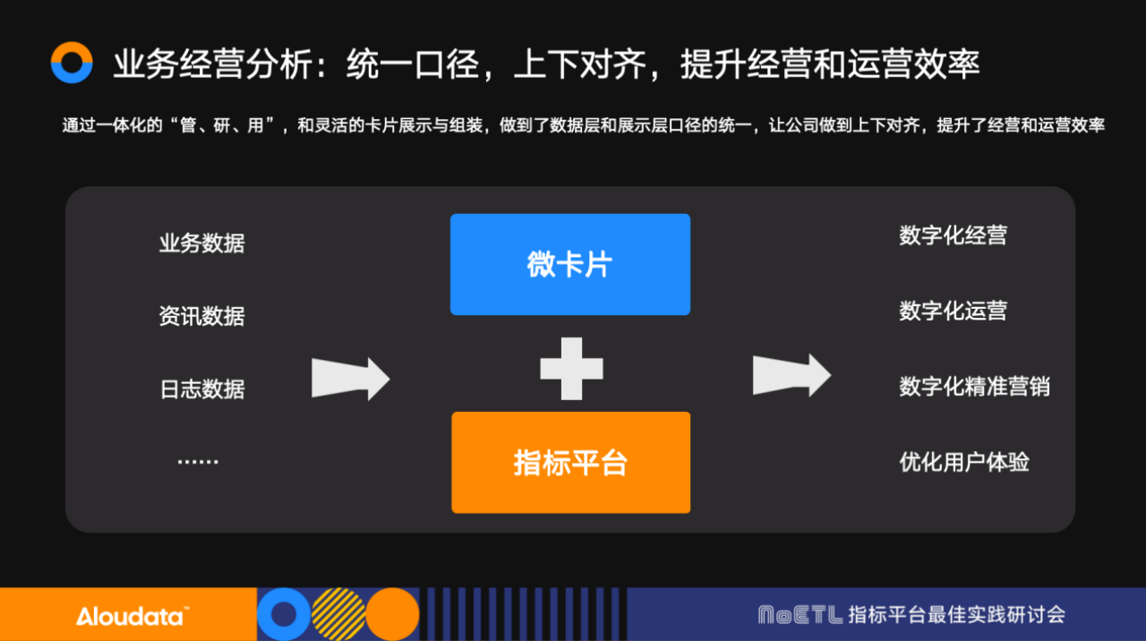 通过建立“管研用”一体的指标体系,和灵活的卡片展示与组装,公司实现了数据层和展示层的口径统一和上下对齐,提升了经营和运营效率。